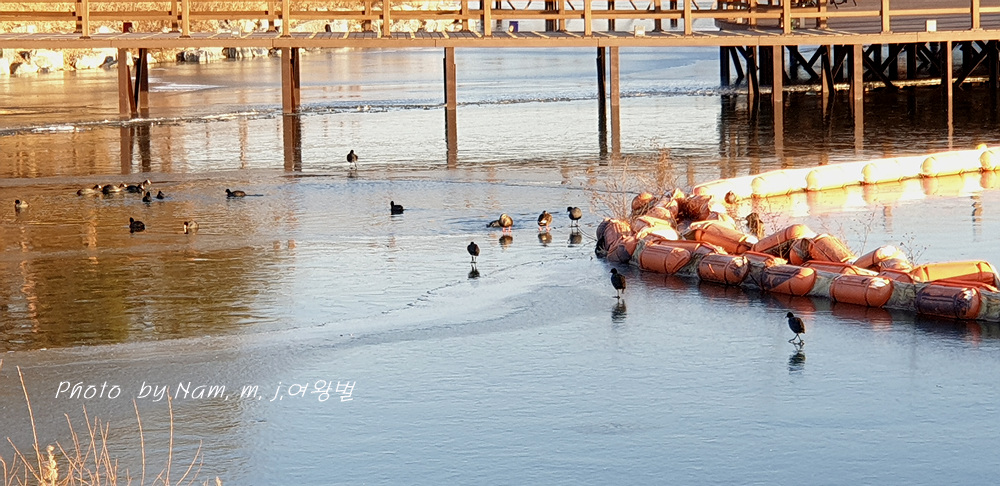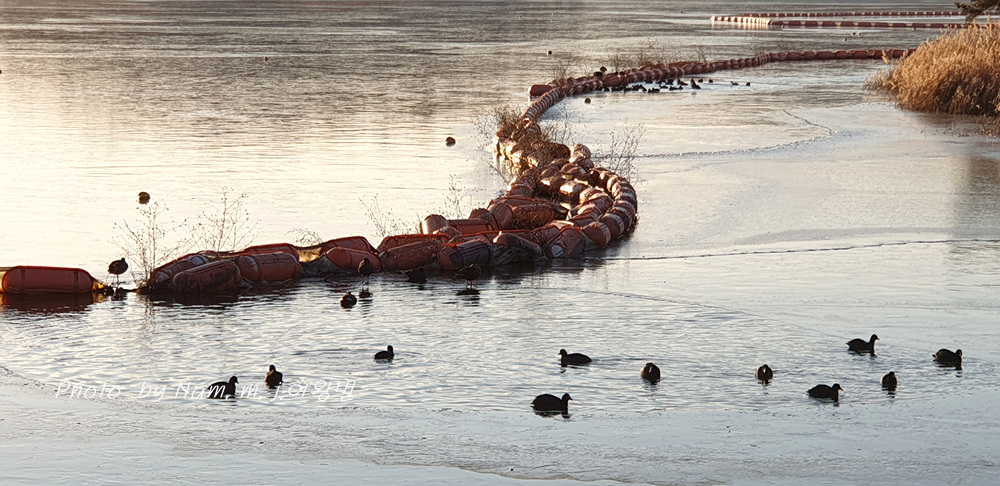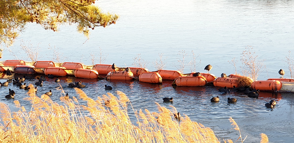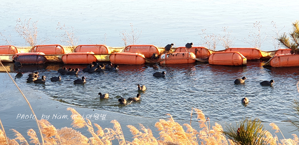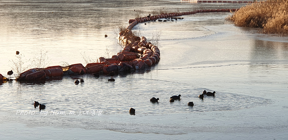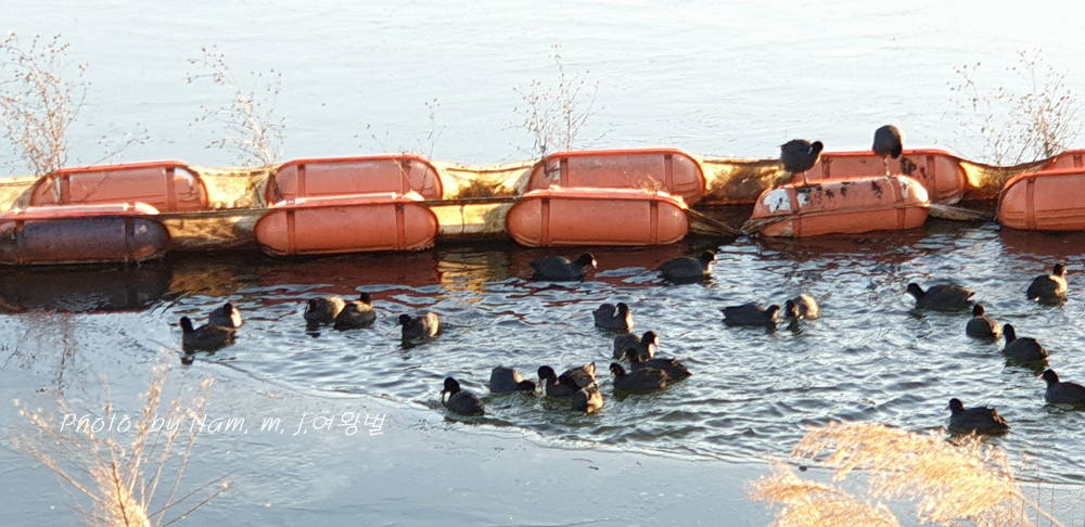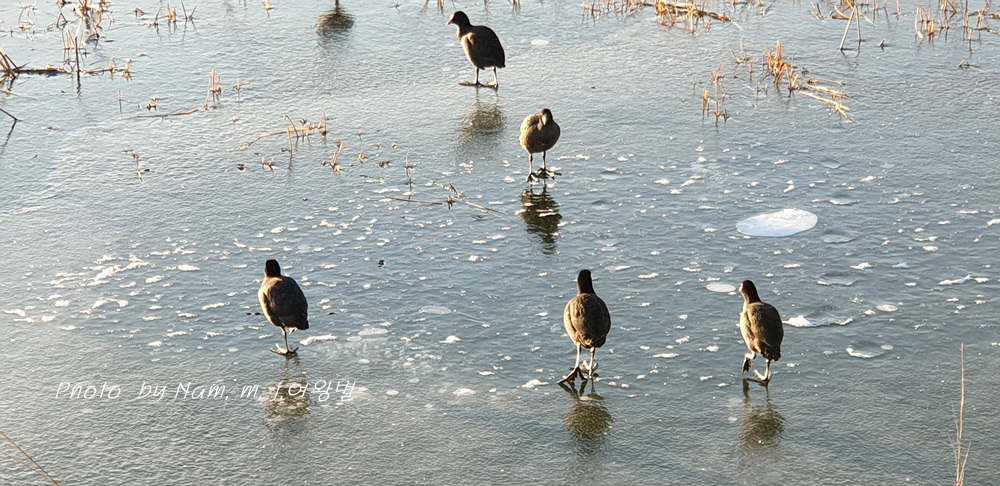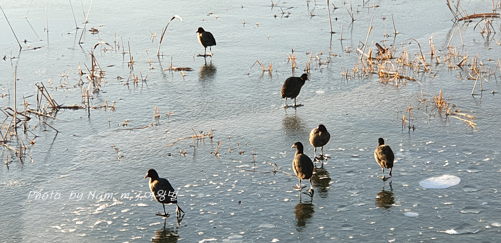호수가 얼어서 물닭들이 먹이 사냥을 할 자리가 사라졌다.