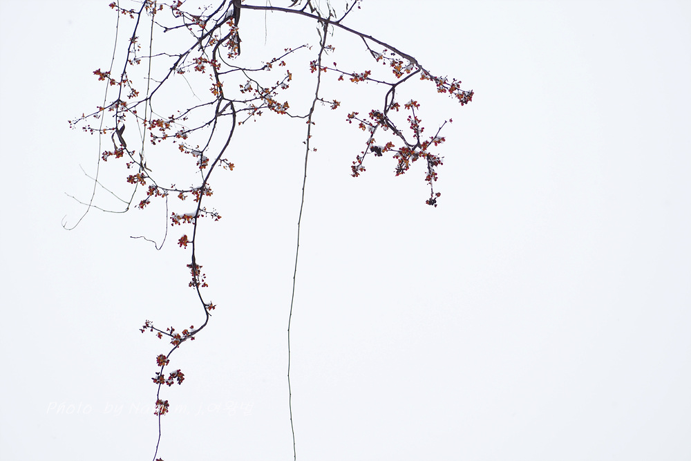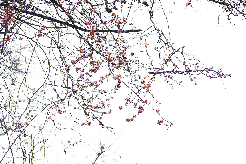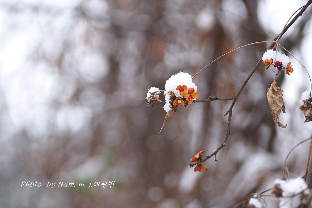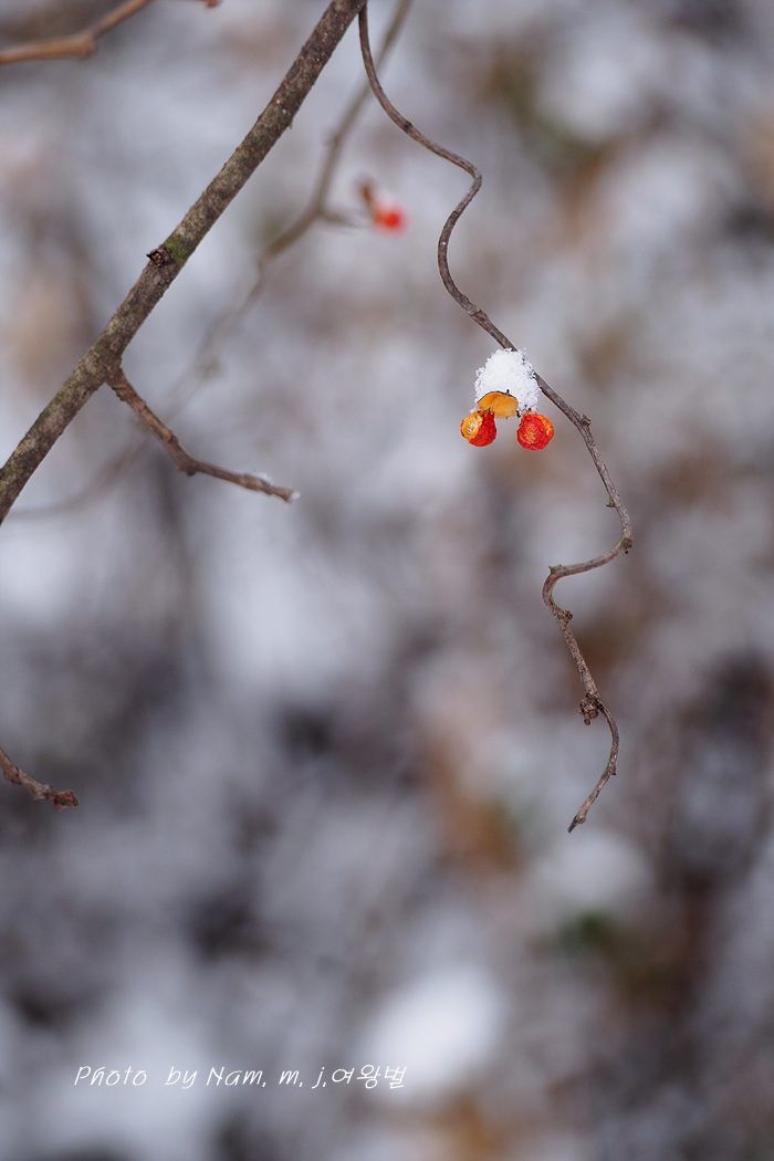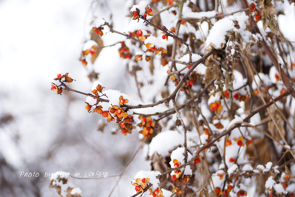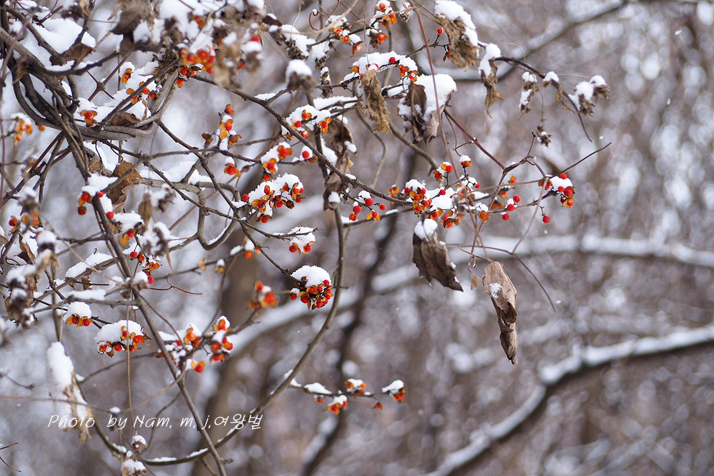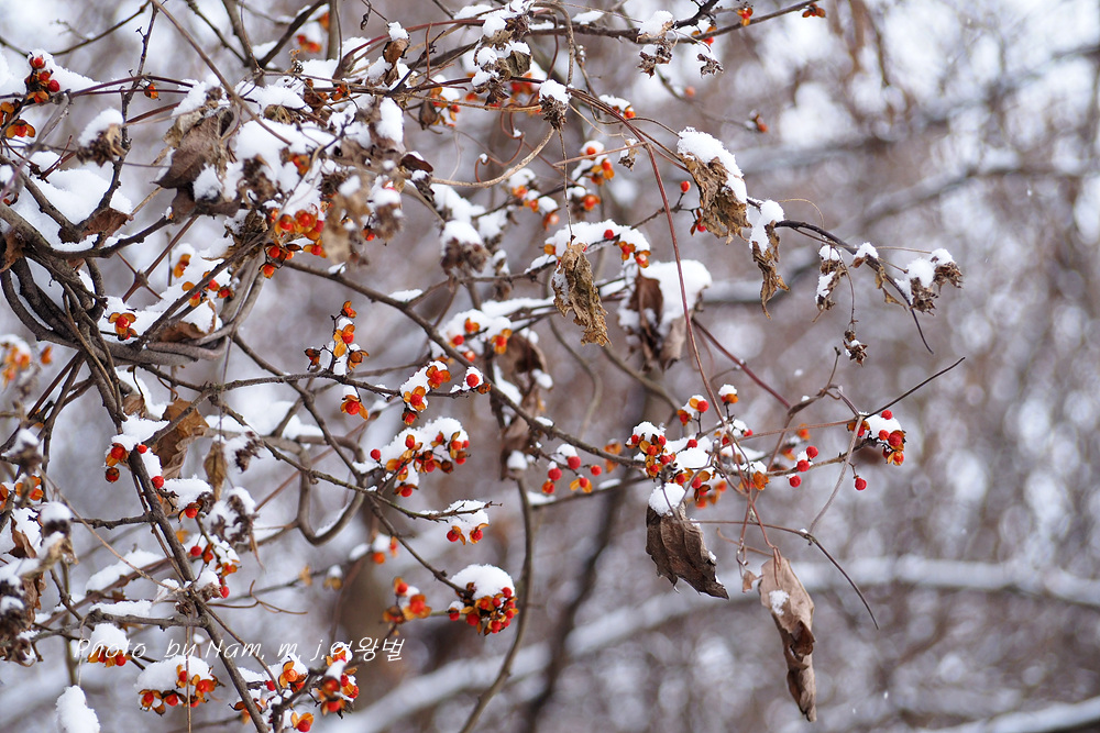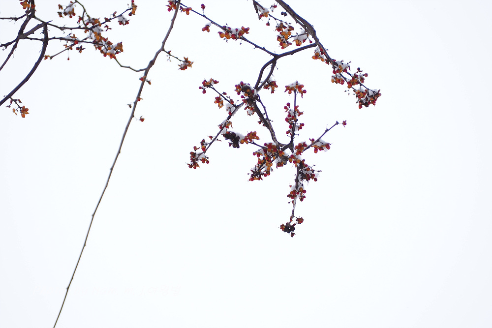 시골길이 미끄러웠지만 소원하던 눈 덮인 노박덩굴 열매를 담으려고 용감하게 언덕을 올랐다.