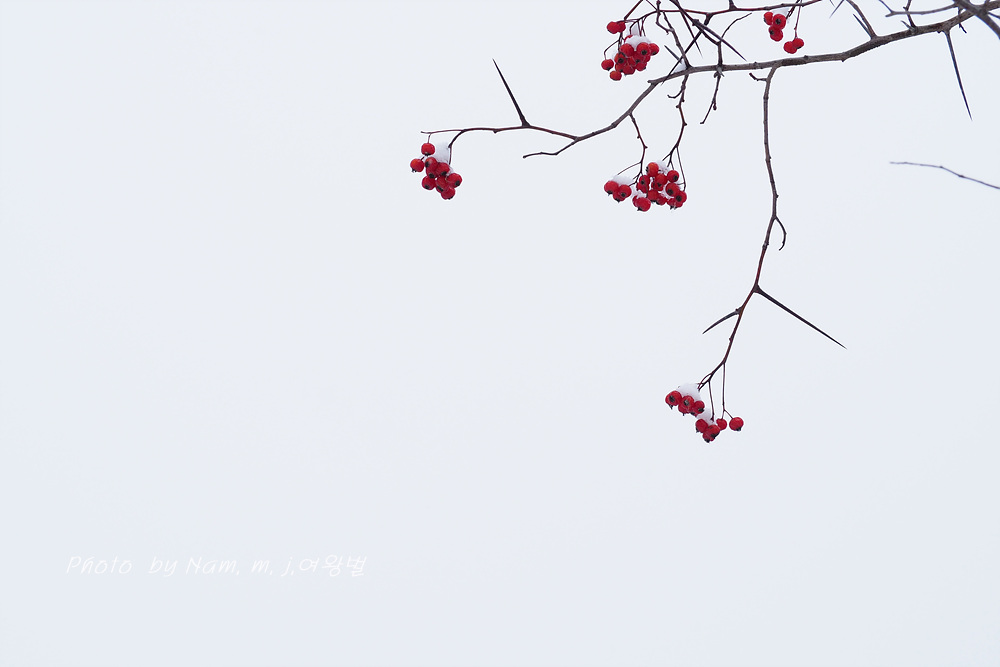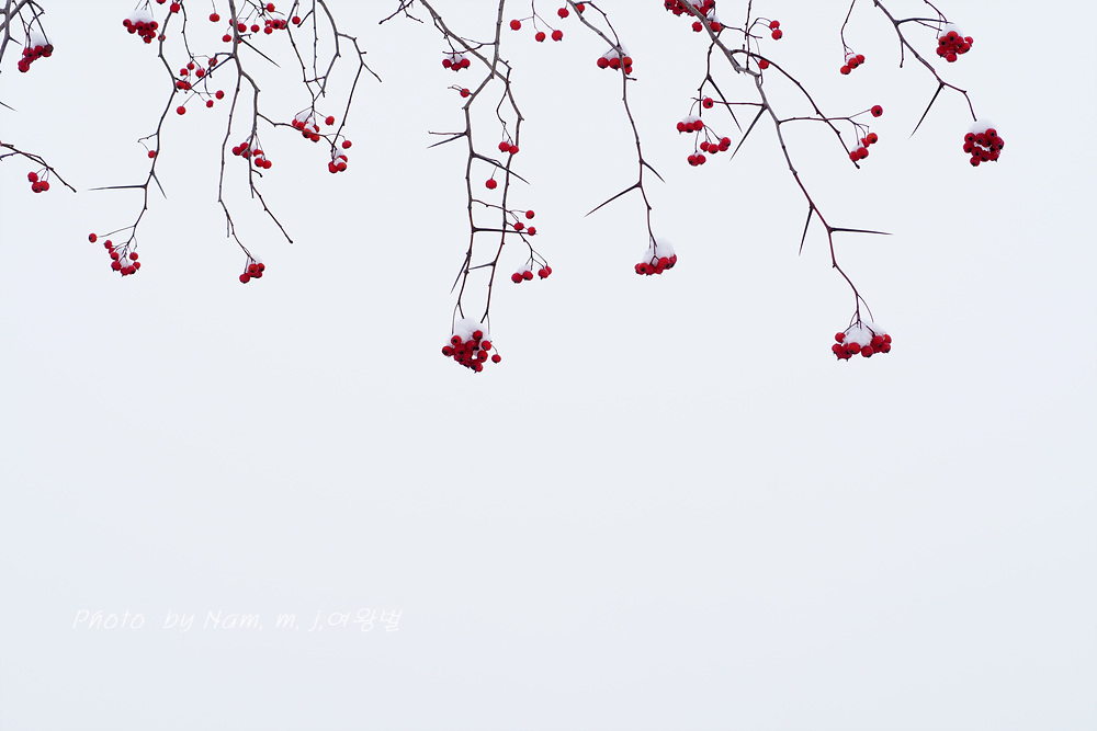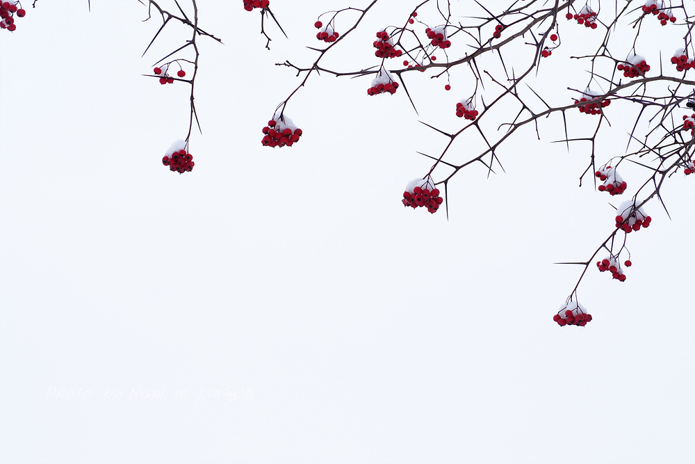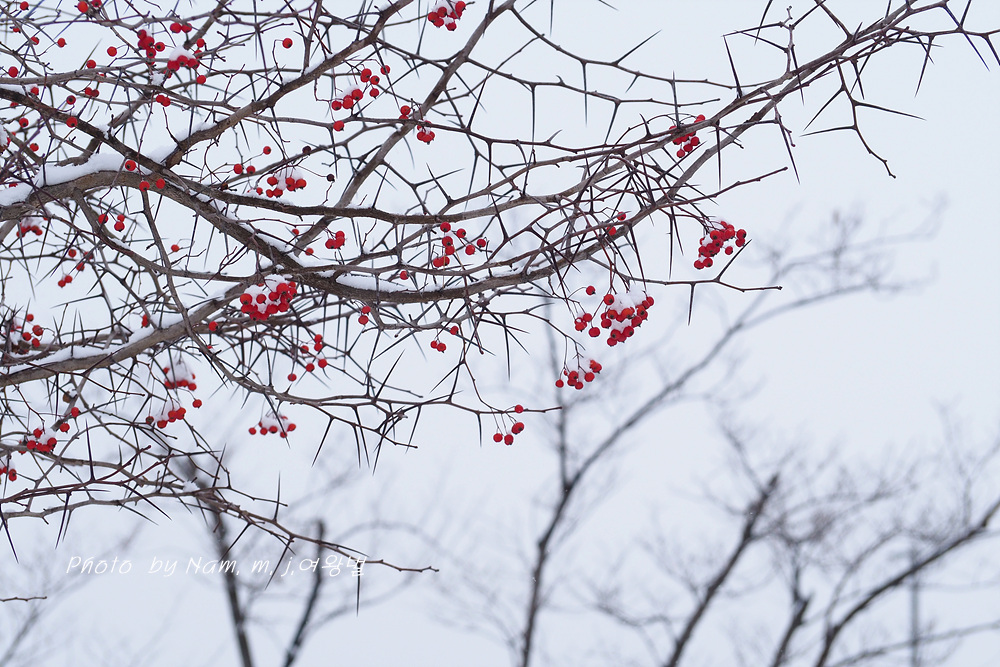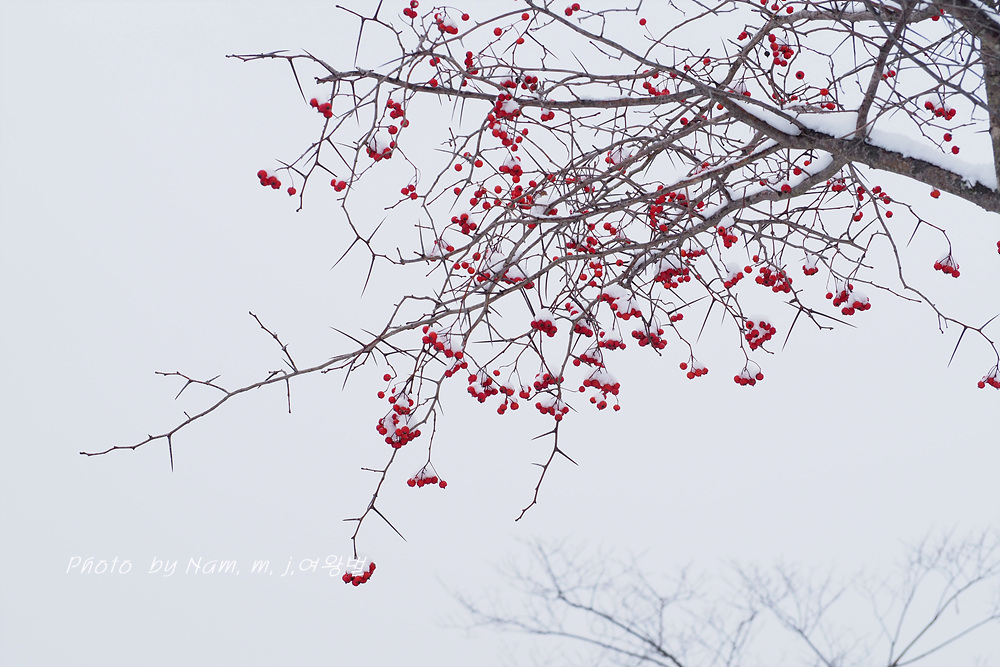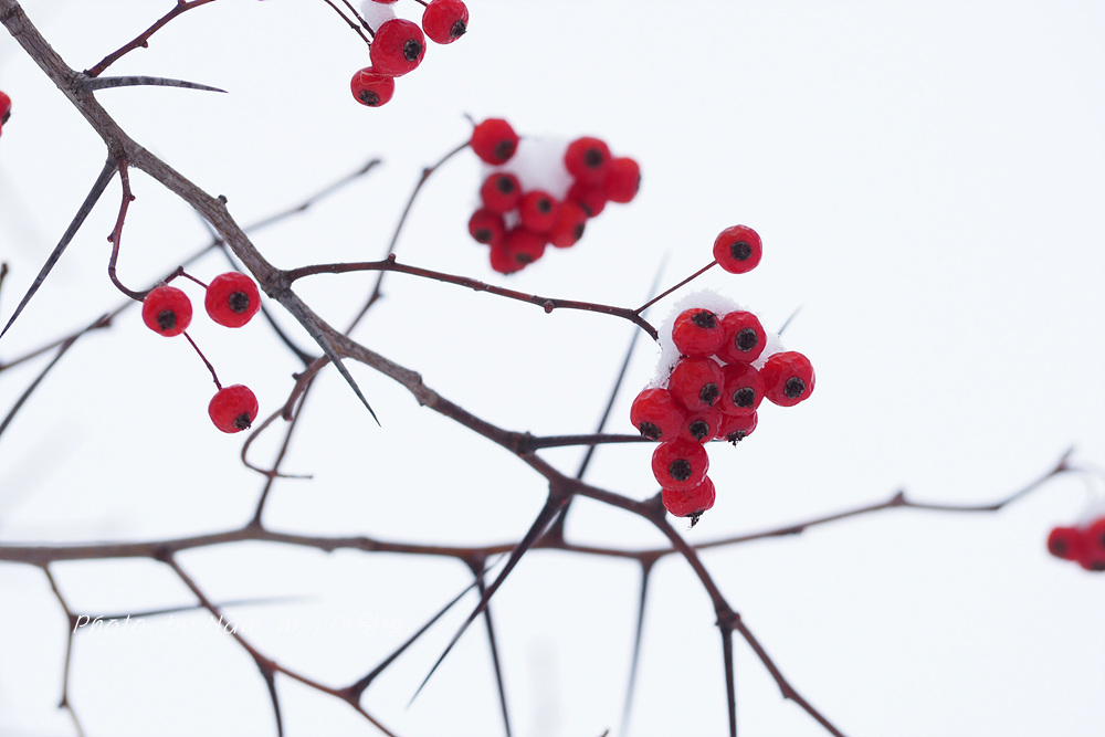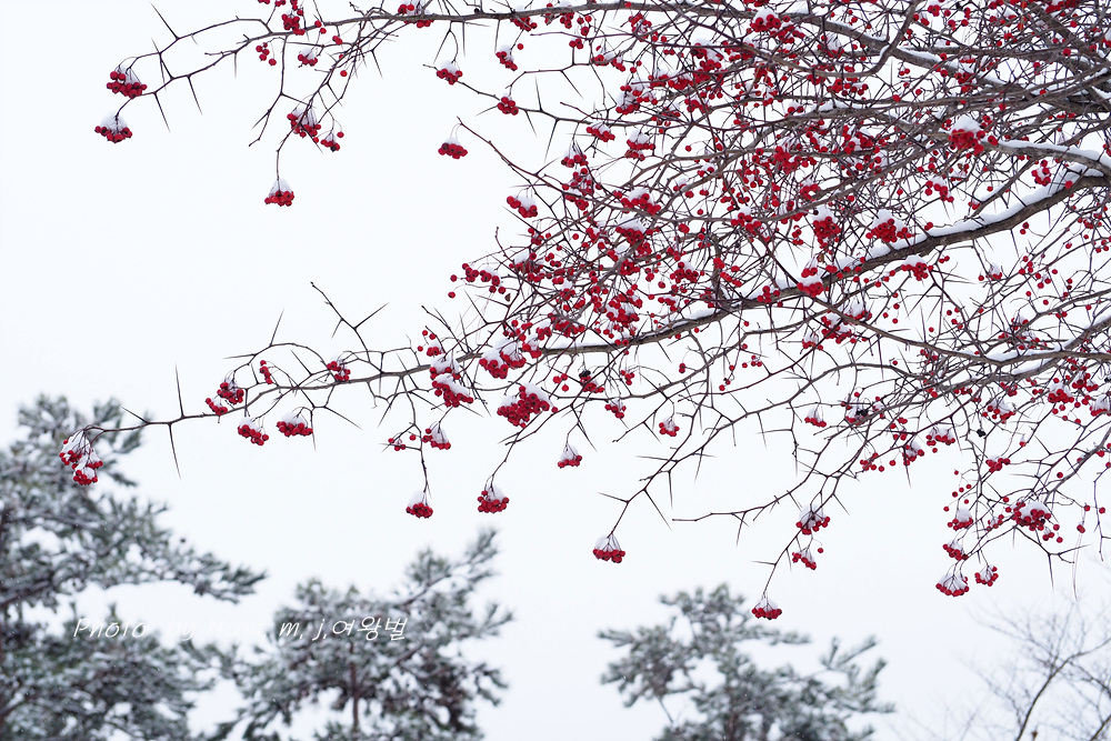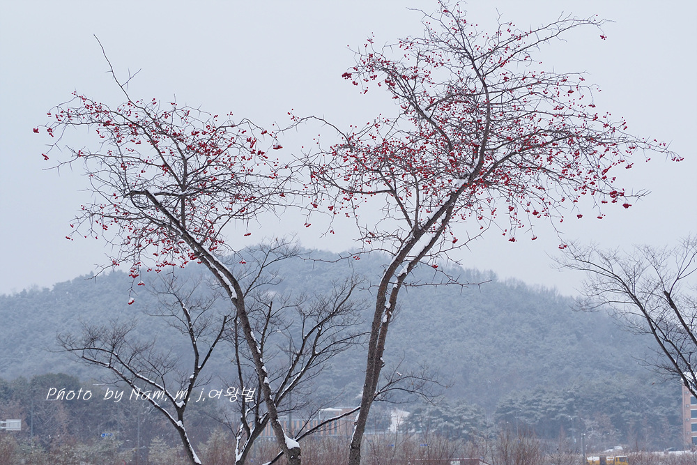 6차선 도로 가운데 조경수로 심겨져 있는 미국산사 열매에도 눈이 쌓였다.