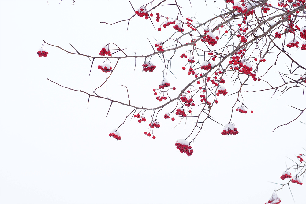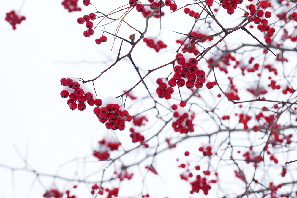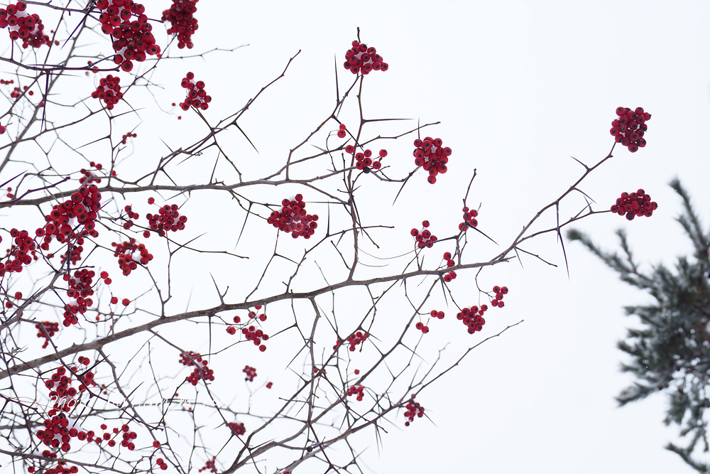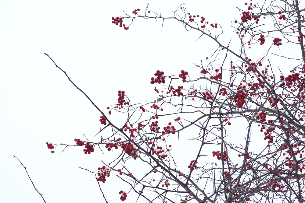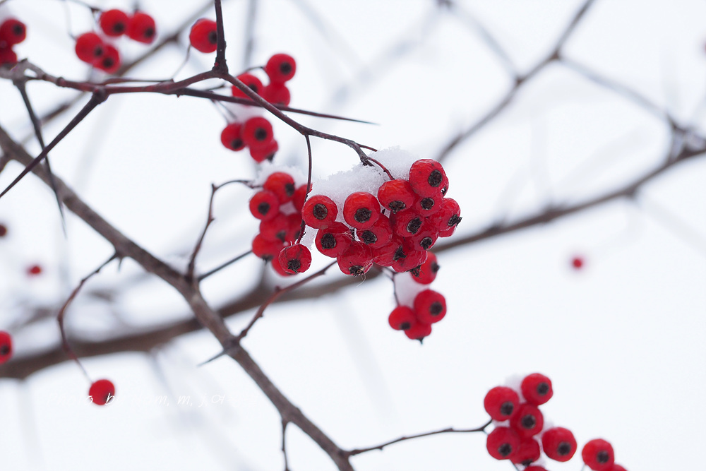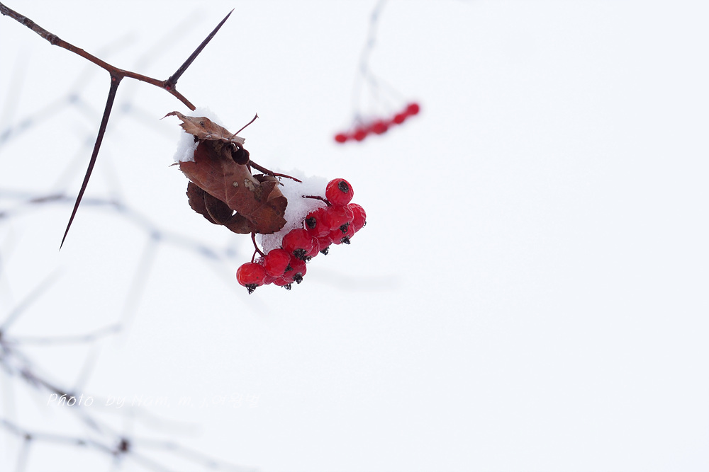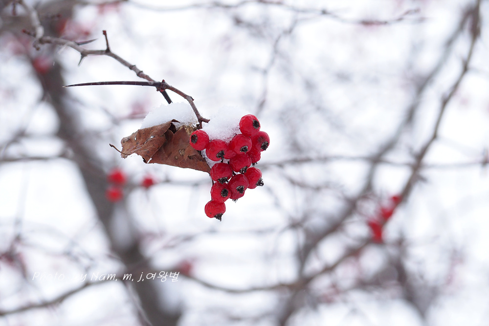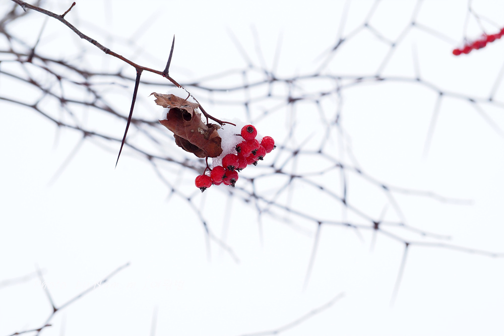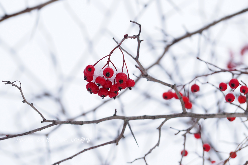 6차선 도로 가운데 조경수로 심겨져 있는 미국산사 열매에도 눈이 쌓였다.