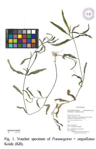 | 한반도 미기록식물인 얼치기대가래(Potamogeton × anguillanus Koidz.)를 강원도 영월군 남면 연당리 연당천에서 발견하였다. 얼치기대가래는 대가래(P. wrightii Morong)와 넓은잎말 (P. perfoliatus L.)의 자연교잡종이다. 대가래에 비해 잎자루가 짧고, 넓은잎말에 비해 잎이 좁고 길며, 밑부분이 줄기를 완전히 감싸지 않는 특징으로 구별된다. 본 미기록식물의 국명은 교잡종임을 고려하여 얼치기대가래로 신칭하였다. 본 종은 일본학자 Koidzumi (1929)가 일본의 중서부지역에 제한적으로 분포하는 고유종으로 처음 학계에 알렸으며, 이후 Kadono (1994)는 잡종으로 취급하고, lida and Kadono (2000, 2002)는 분자생물학적인 방법을 통하여 대가래(P. wrightii)와 넓은잎말(P. perfloiatus)에서 파생된 자연 교잡종임을 밝혔다. 외부형태학적 특징으로는 부모종과 달리, 대가래에 비해서는 잎자루가 짧고, 넓은잎말에 비해서는 잎이 좁고 길며, 줄기를 완전히 감싸지 않는 특징을 갖는다(Iida and Kadono, 2000, 2002; Kadono, 1994). 일본 고유종으로 기재된 것과는 달리 중 국 후베이성의 우한시 지역에 분포할뿐만 아니라 국내 강원도 의 영월군 하천에서도 분포가 확인되었다 |