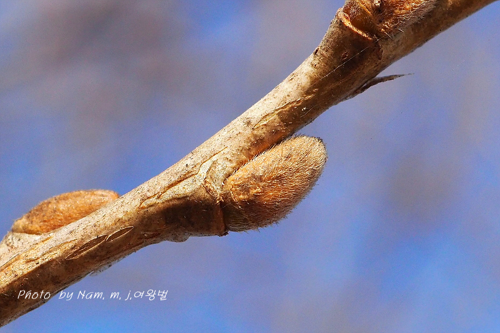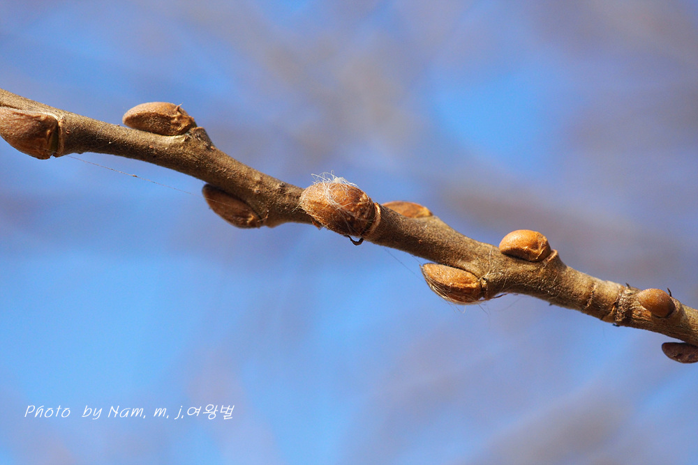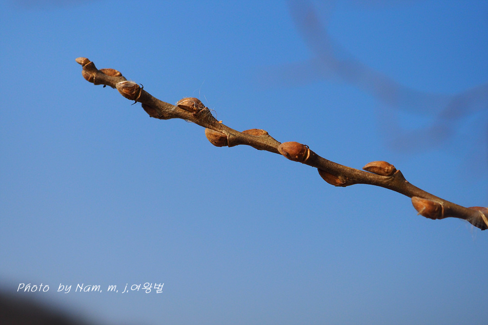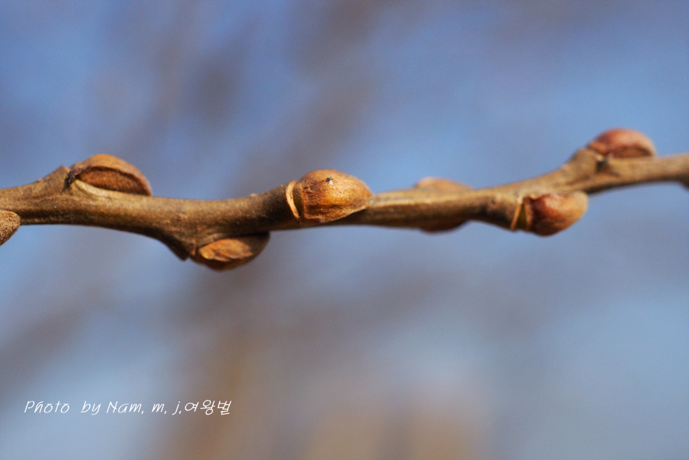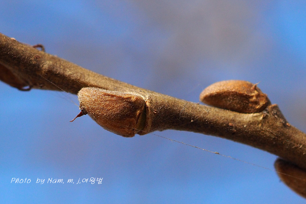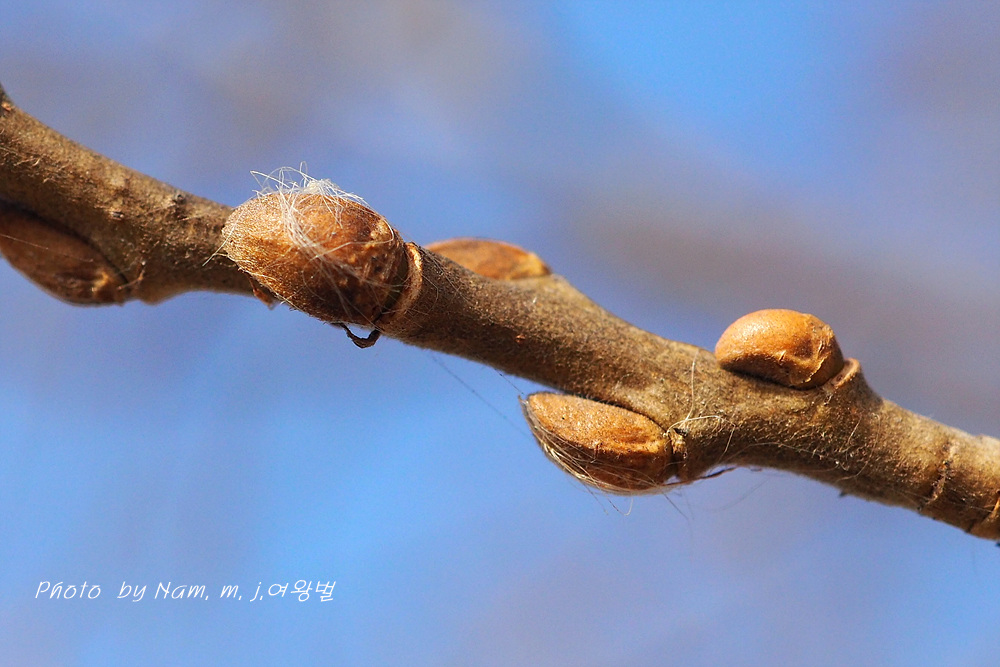 짧은 가지에 동아 간격이 좁고 매우 통통한 모양으로 인편에 털이 있다.