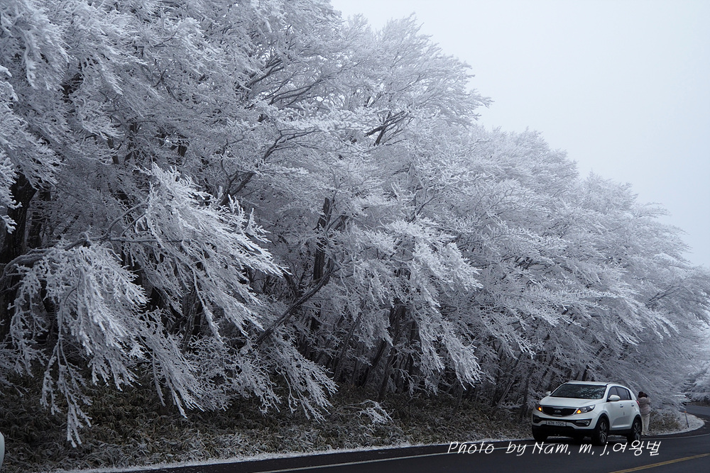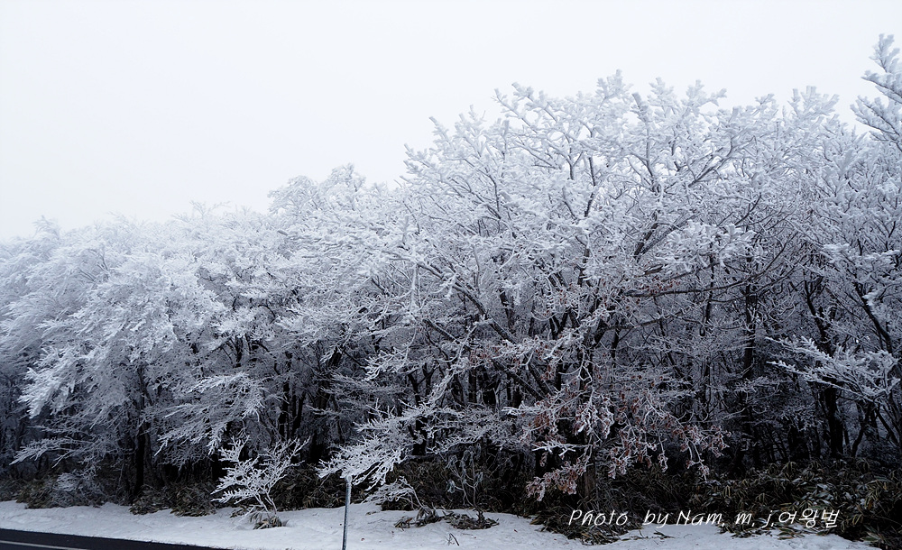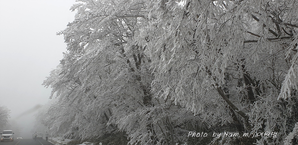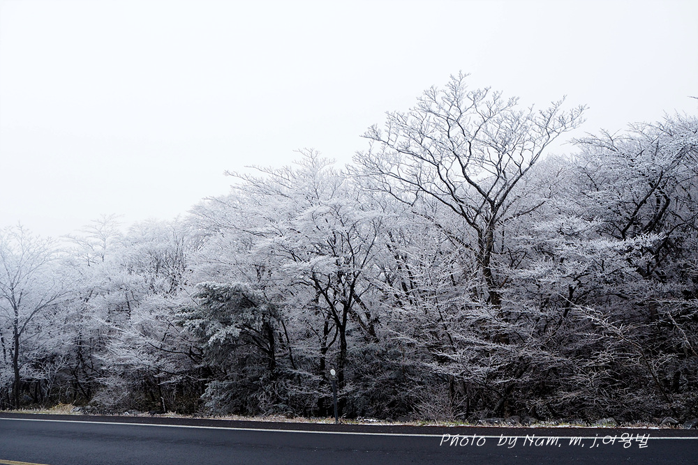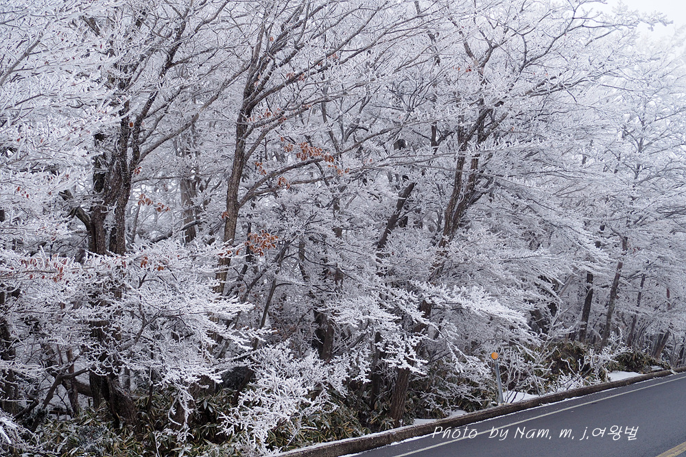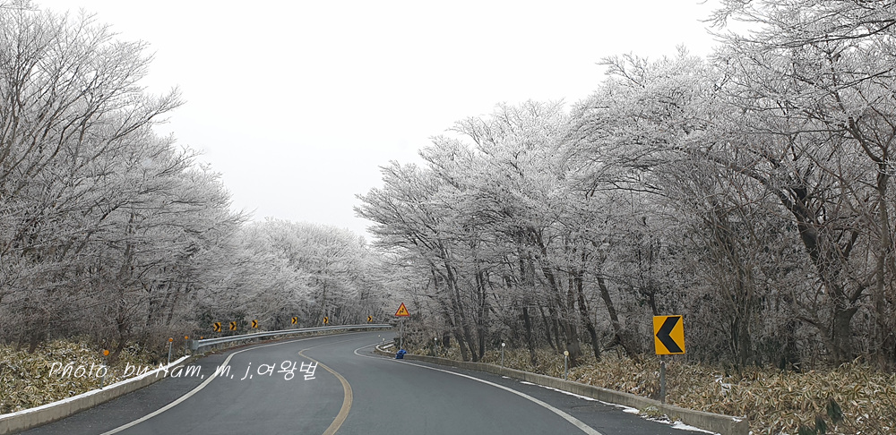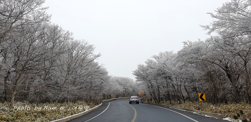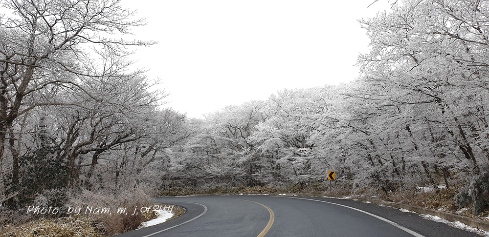 서귀포 쪽는 해가 뜨기도 하고 구름이 낀 흐린 곳도 있었는데 상고대로 하얀 세상을 만든 산록 도로는 환장적인(?) 천국이었다.