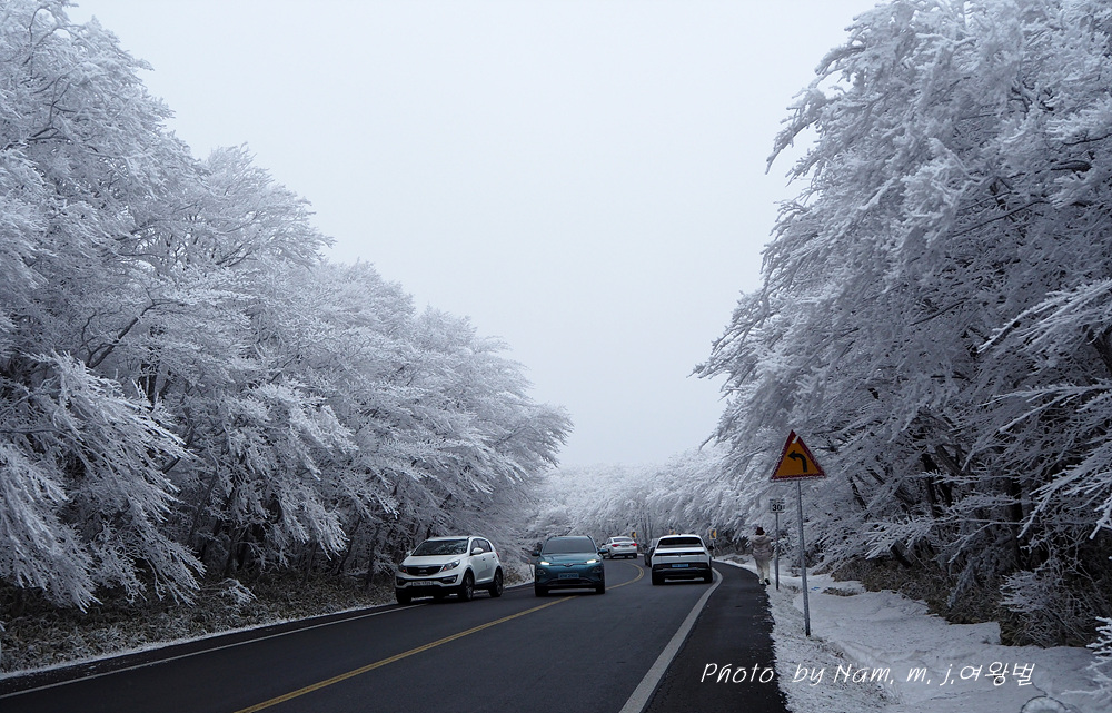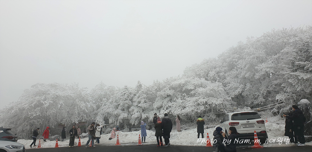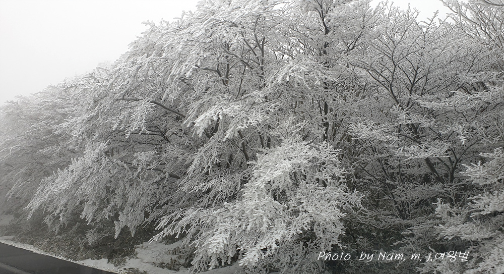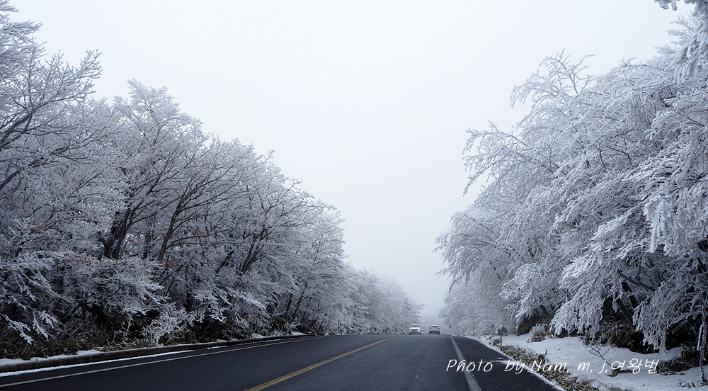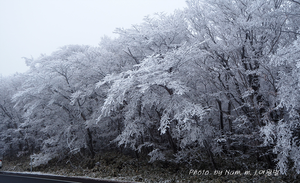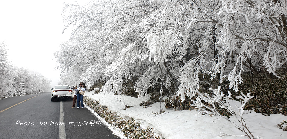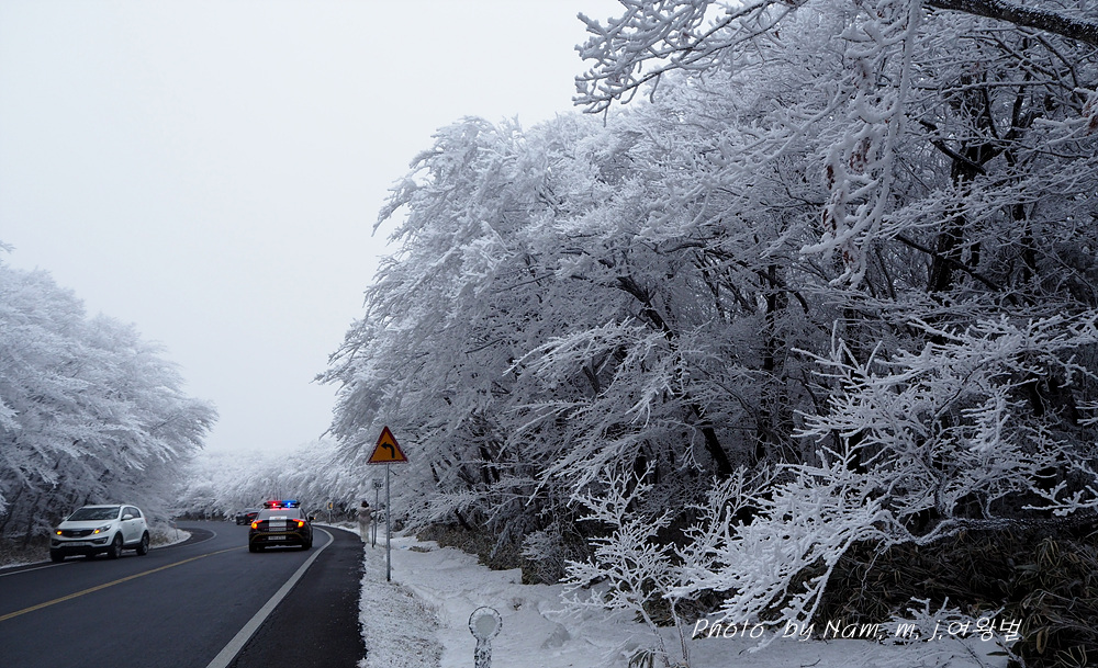 서귀포 쪽는 해가 뜨기도 하고 구름이 낀 흐린 곳도 있었는데 상고대로 하얀 세상을 만든 산록 도로는 환장적인(?) 천국이었다.
