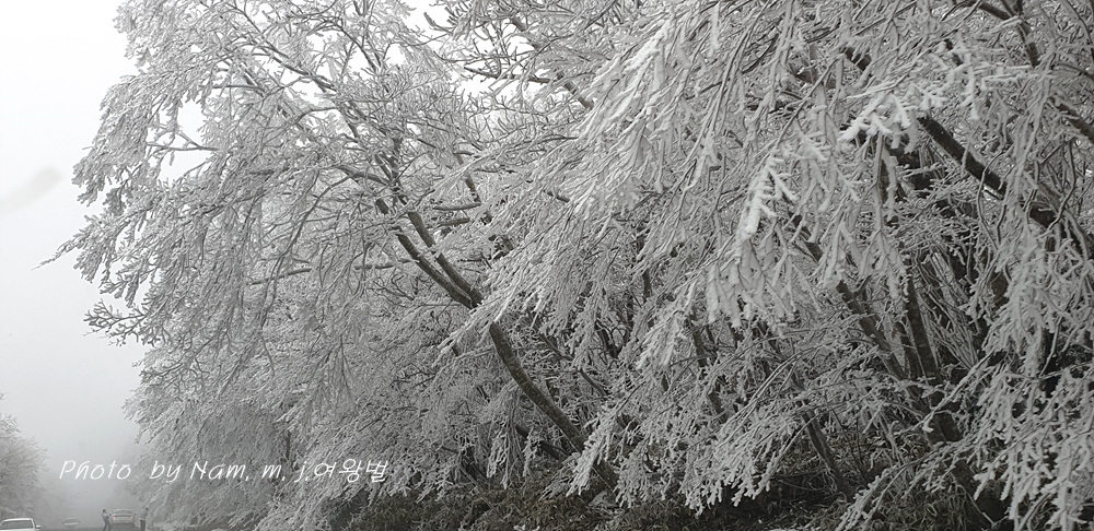 뜻밖의 상고대에 소리를 지르면서 갓길에 주차를 하고 몇 장 사진을 찍다가 좁은 갓길이라 불안해서 다시 시동을 건다.
