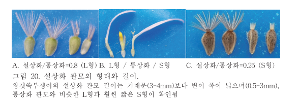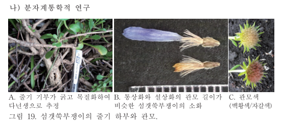 "섬갯쑥부쟁이 집단 중에는 설상화 관모 길이에 변이가 커서 설상화/통상화의 관모 길이 비가 0.2-0.9 이르는 것으로 확인되었다(그림 19-B)