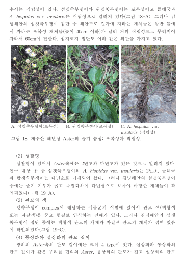 이 보고서의 내용에는 제주도 해안의 섬갯쑥부쟁이, 돌해국, 왕갯쑥부쟁이를 집중 연구 분석한 결과를 정리해 두었는데
