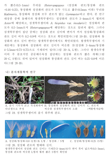 "왕갯쑥부쟁이: 다년초 포복성 줄기(직경 5-10mm) 주걱형잎(5-10cm)| 설상화와 통상화의 관모 길이가 비슷한(3-4mm) 것으로 기재되었으나 왕갯쑥부쟁이의 분포지인 중문해수욕장 집단에는 설상화 관모가 짧은 개체(그림 20-C, S형)도 섞여 있었다. 왕갯쑥부쟁이의 설상화 관모 길이는 0.5-3mm로 설상화와 통상화의 관모 길이 비는 0.25 - 0.8에 이른다. 기준 표본을 정하고 기재문을 수정하여 고유종으로 정당공표할 필요가 있다(그림 20). 비금도에서도 확인되었다."