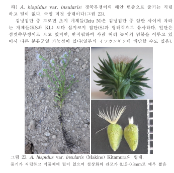 결국 돌해국은 섬갯쑥부쟁이 중 관모 길이의 변화 개체를 일본고유종인 Aster asagrayi으로 오인했다는 것이다.