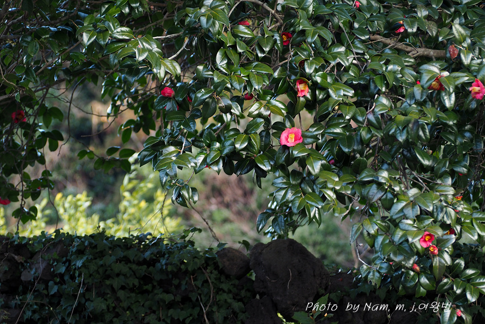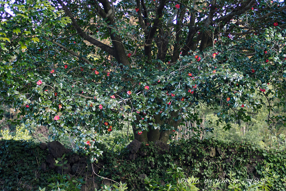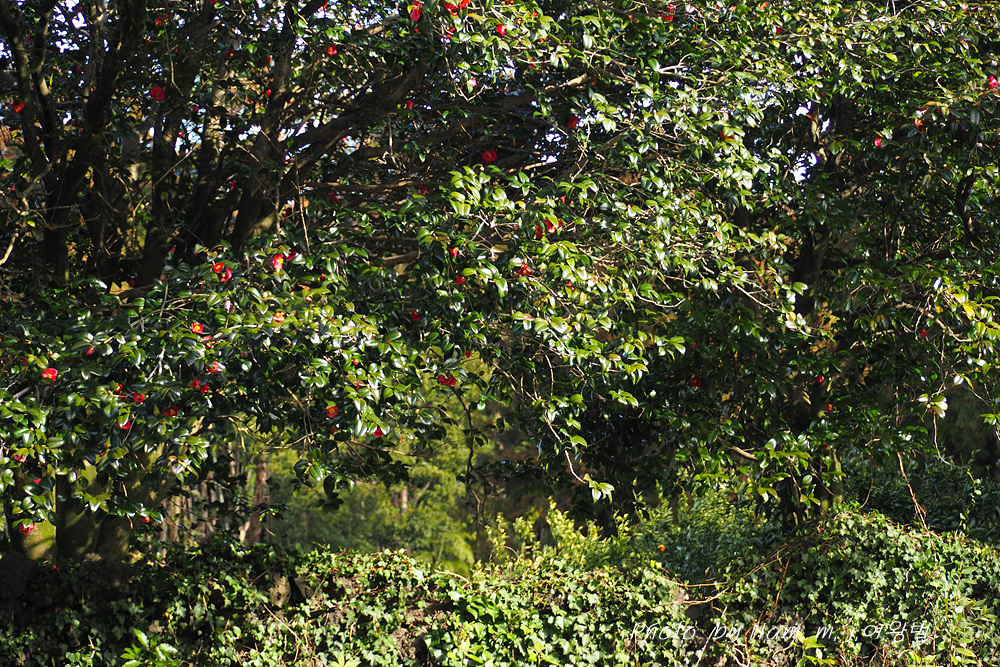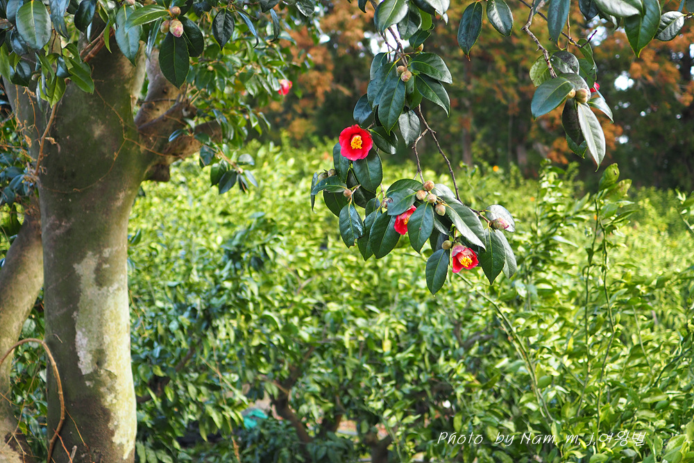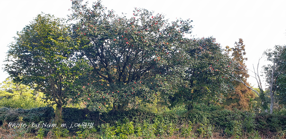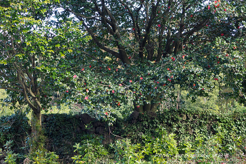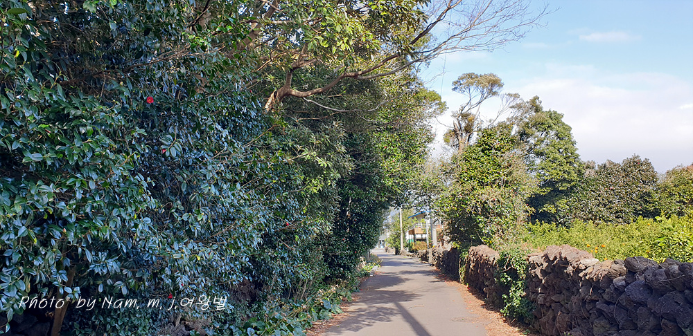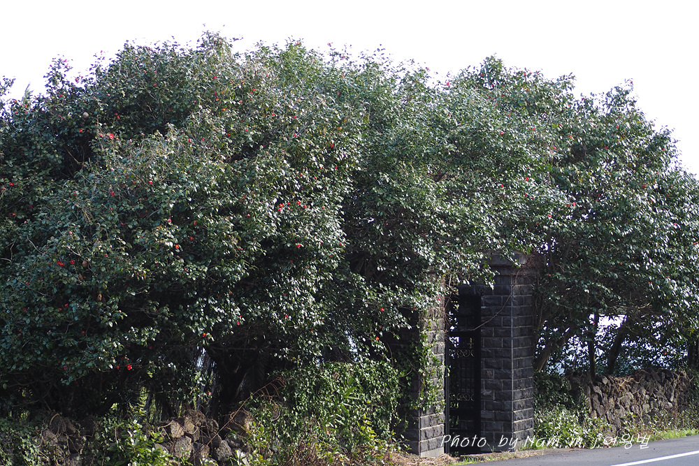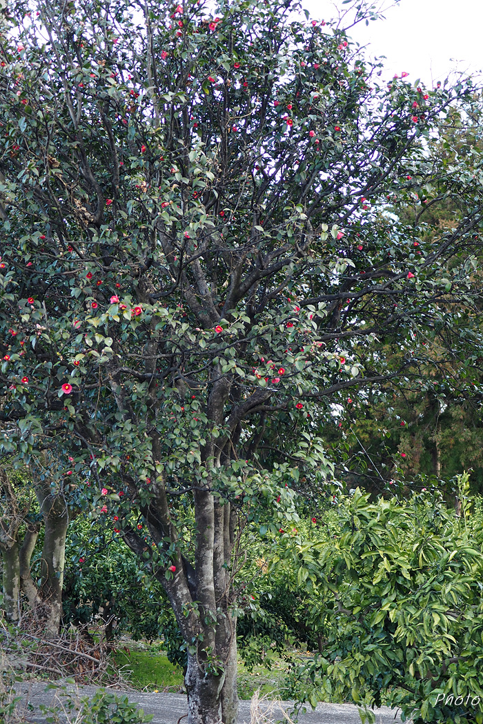 귤밭 방품림으로 삼나무를 주로 심어두었지만 그 사이 사이에 수령이 오래된 토종 동백나무가 보인다. 마을 도로변 양쪽의 가로수도 모두 동백나무이다.