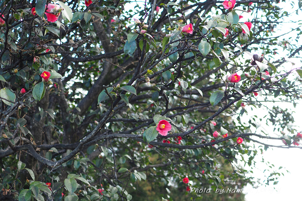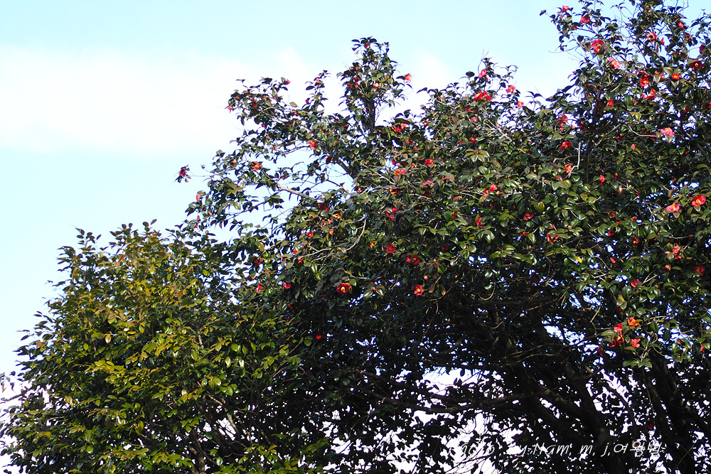 개량 동백 사이에 토종 동백나무가 드문드문 서 있는데 다행하게도 개화를 시작한 녀석들이 좀 보인다.