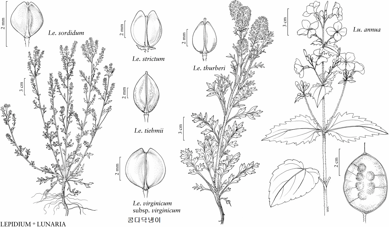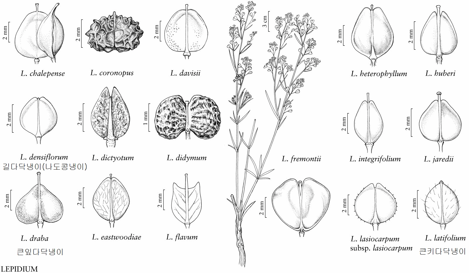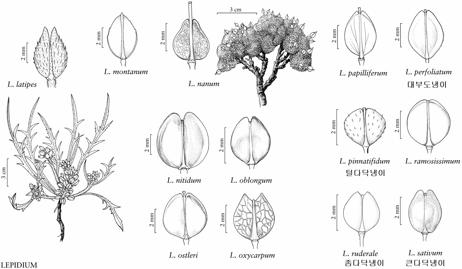 | 1a. Cauline leaves sessile, amplexicaul, sagittate, or auriculate at base. 2a. Flowers yellow; upper leaves amplexicaul-perfoliate, basal leaves 2- or 3-pinnatisect; seeds winged all around................................................................................................. 10. 대부도냉이L. perfoliatum 2b. Flowers white; upper leaves auriculate or sagittate, basal leaves entire, dentate, or pinnatifid; seeds wingless. 3a. Annuals or biennials, usually densely long pubescent; fruit wings united with lower part of style; leaves herbaceous ................................................................................ 1.들다닥냉이 L. campestre 3b. Perennials, glabrous, papillate, or crisped hairy; fruit wings free from style; leaves leathery. 4a. Basal and lowermost cauline leaves pinnatifid, upper ones subentire; plants glabrous .......................................................................................... 3.앉은잎다닥냉이 L. cordatum 4b. All leaves entire; plants with curved papillate trichomes .............. 4. L. cartilagineum 1b. Cauline leaves petiolate or subsessile, cuneate or obtuse at base, if subauriculate then plants with capitate or clavate papillae. 5a. Stamens 6; stems glabrous or pubescent with long trichomes (puberulent in L. alashanicum). 6a. Petals absent; plants puberulent with subclavate papillate trichomes; all leaves linear, entire, margin involute .................................................................................... 9. L. alashanicum 6b. Petals well developed; plants glabrous or pilose with slender trichomes; leaves variously-shaped, at least some pinnatifid, pinnatisect, dentate, or serrate, margin flat. 7a. Annuals; fruit (4–)5–6 mm, winged all around, broadly so apically; all or at least lower leaves 1- or 2-pinnatisect or -pinnatifid; cotyledons 3-lobed ............................... 2.큰다닥냉이 L. sativum 7b. Perennials; fruit 1.5–3 mm, wingless or only apically winged; leaves entire, serrate, or dentate; cotyledons entire. 8a. Sepals persistent in fruit; fruit cordate at base ................................... 7. L. obtusum 8b. Sepals deciduous shortly after anthesis; fruit cuneate, obtuse, or rounded at base. 9a. Basal and lowermost cauline leaves pinnatifid or lyrate, with oblong or linear lateral lobes much smaller than terminal one; style (0.2–)0.3–0.4(–0.5) mm, distinctly exserted from apical notch........................................... 8. L. lacerum 9b. Basal and lowermost leaves dentate, serrate, or subentire; style absent, obsolete, or rarely to 0.1 mm. 10a. Uppermost cauline leaves sessile or subsessile, leathery; fruit not carinate; seeds (0.8–)1–1.3 mm.............................................................................. 6. 큰키다닥냉이 L. latifolium 10b. Uppermost cauline leaves shortly petiolate, papery; fruit carinate; seeds 1.5–2.2 mm .................................................................................................................. 5. L. ferganense 5b.Stamens 4 or 2; stems puberulent with clavate or capitate papillae, sometimes with minute trichomes. 11a. Stamens 4; style longer than and exserted from apical notch of fruit ..........11. L. cuneiforme 11b. Stamens 2; style shorter than and included within apical notch of fruit. 12a. Fruit orbicular; upper stems and rachis puberulent with curved minute trichomes; cotyledons accumbent .................................................................................... 13. 콩다닥냉이L. virginicum 12b. Fruit elliptic, ovate, or obovate; upper stems and rachis puberulent with straight or clavate papillae; cotyledon incumbent. 13a. Middle and upper cauline leaves usually pinnatifid; infructescences capitate; petals 0.5–1 mm ..................................................................... 12. L. capitatum 13b. Middle and upper cauline leaves dentate, serrate, or entire; infructescences elongated racemes; petals absent or rudimentary. 14a. Basal leaves 2- or 3-pinnatisect; pedicels puberulent all around with slender trichomes; herbs fetid ........................................................................................ 14. 좀다닥냉이 L. ruderale 14b. Basal leaves 1-pinnatifid or serrate; pedicel papillate only adaxially; herbs not fetid. 15a. Fruit broadly obovate, widest above middle; raceme papillae terete or subclavate ............................................................................................................... 15.길다닥냉이 L. densiflorum 15b. Fruit elliptic, widest at middle; raceme papillae clavate or capitate ............................................................................................................... 16. 다닥냉이L. apetalum |