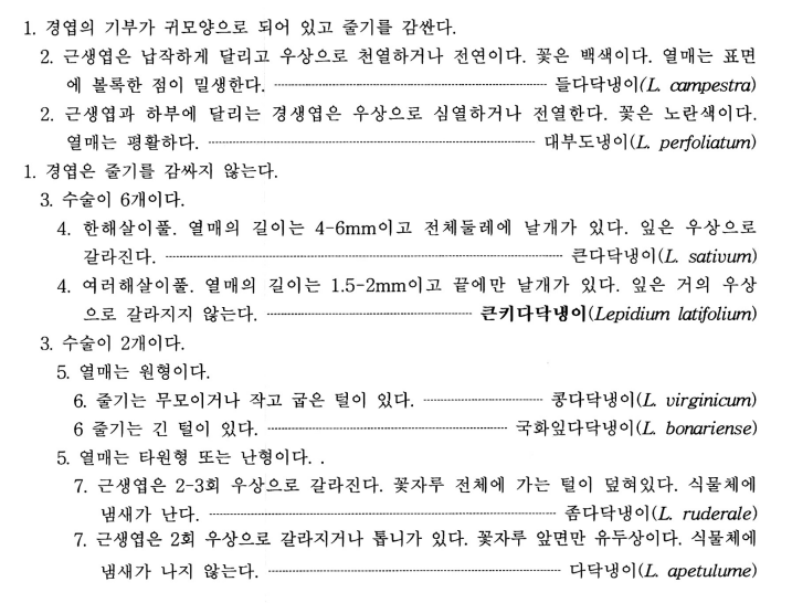 1. 열매는 원형, 줄기 상부와 화축, 화경에 굽은 털이 있다 -------------------------------------콩다닥냉이(L. virginicum) 1. 열매는 타원형, 난형 또는 도란형, 줄기 상부와 화축, 화경에, 개출모, 또는 곤봉상 돌기이다 2. 중부와 상부의 경생엽은 치아상거치, 예거치 또는 전연, 꽃잎은 없거나 흔적적이다 3. 근생엽은 2-3회 우상 전열, 소화경은 전체적으로 가는 털, 냄새가 있다.------좀다닥냉이(L. ruderale) 3. 근생엽은 1회 우상 심열 또는 예거치, 소화경 한 쪽 면에만 돌기, 냄새 없음 4. 열매는 중앙 위쪽이 가장 넓은 도란형, 화서에는 원주상 또는 곤봉 모양에 가까운 돌기 -------------------------------------------------------------------------길다닥냉이(나도콩냉이)L. densiflorum 4. 열매는 중앙이 가장 넓은 타원형, 화서에 곤봉상 또는 두상의 돌기--------------- 다닥냉이(L. apetalum) |
