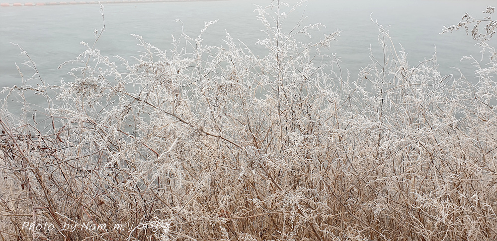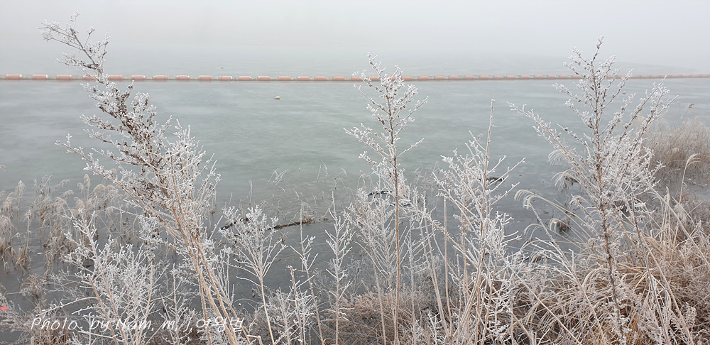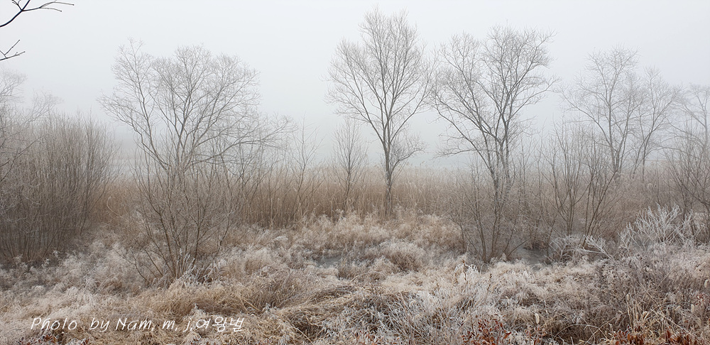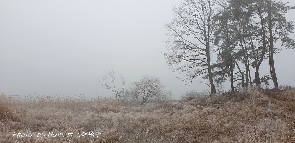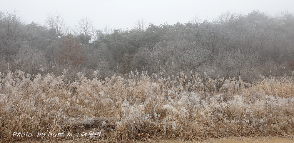 밤에 내려간 기온에 호민지 주변 나무에 상고대 꽃이 폈다.