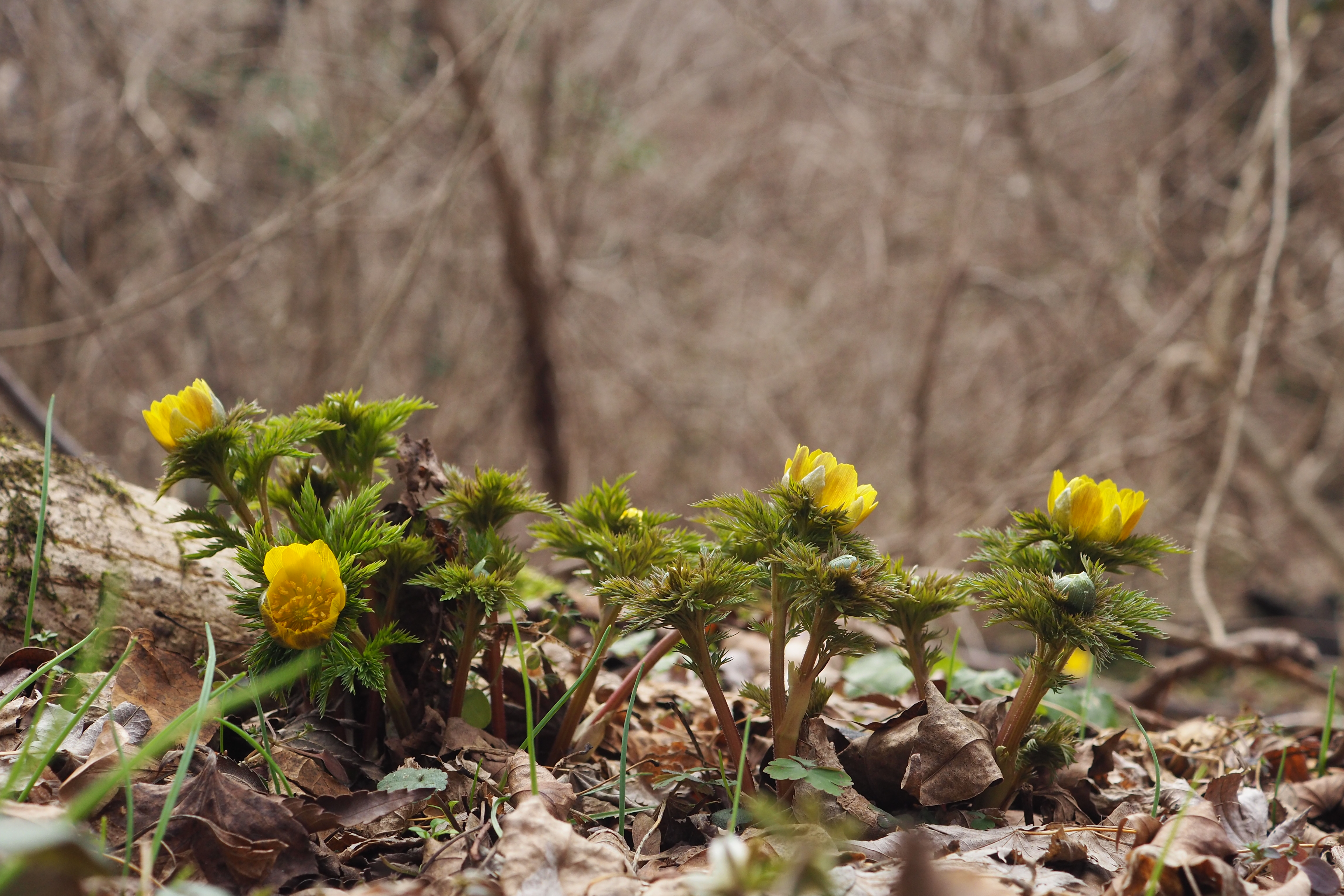 세복수초 줄기가 벌써 길게 자랐고 개화도 꽤 진행되었다