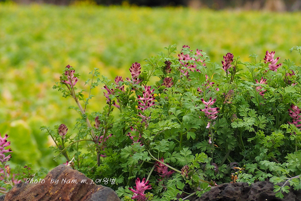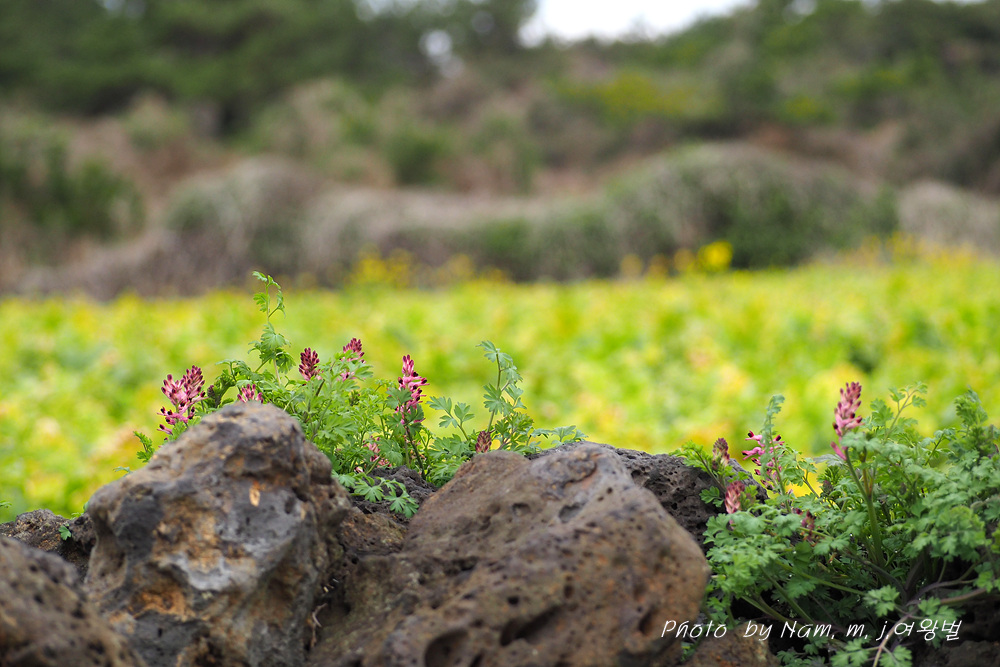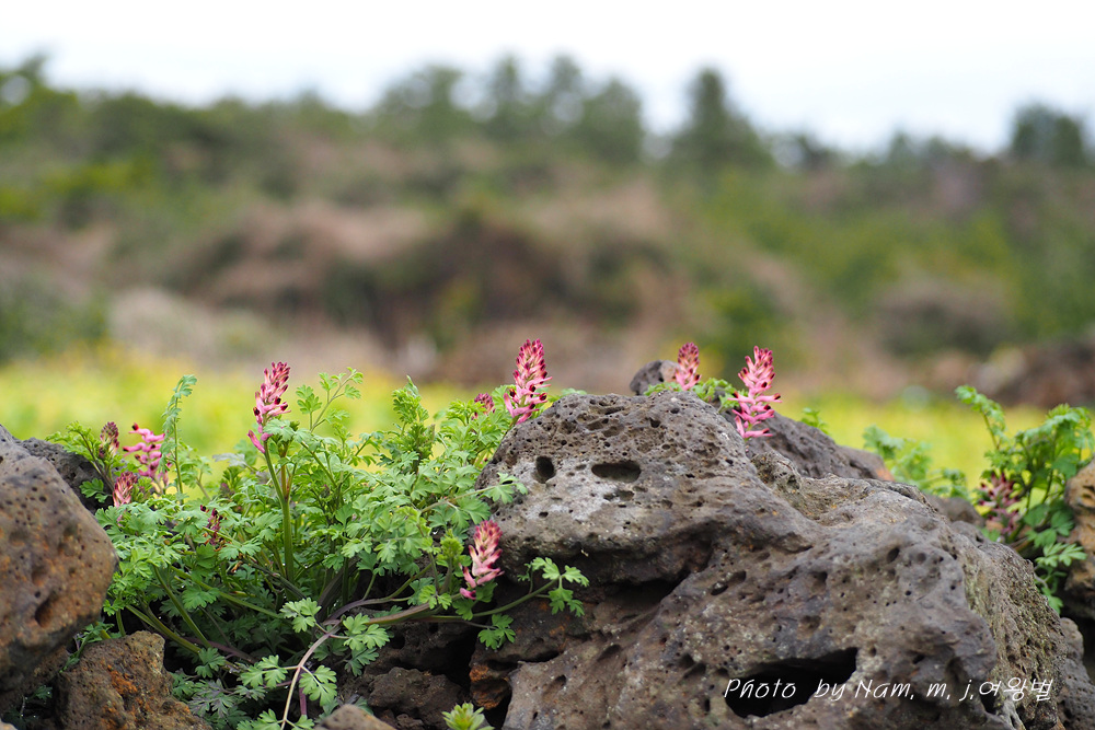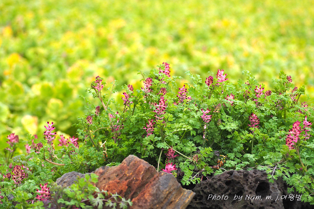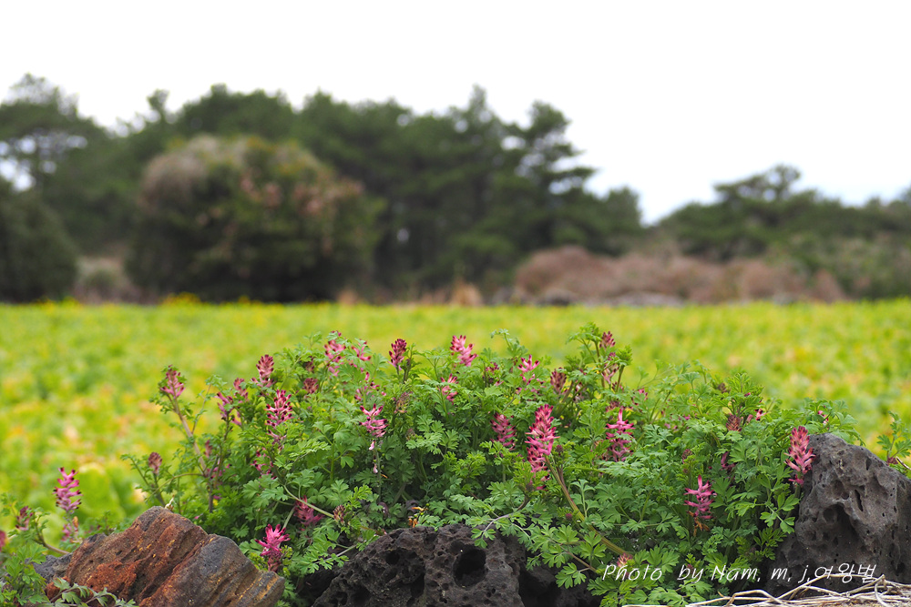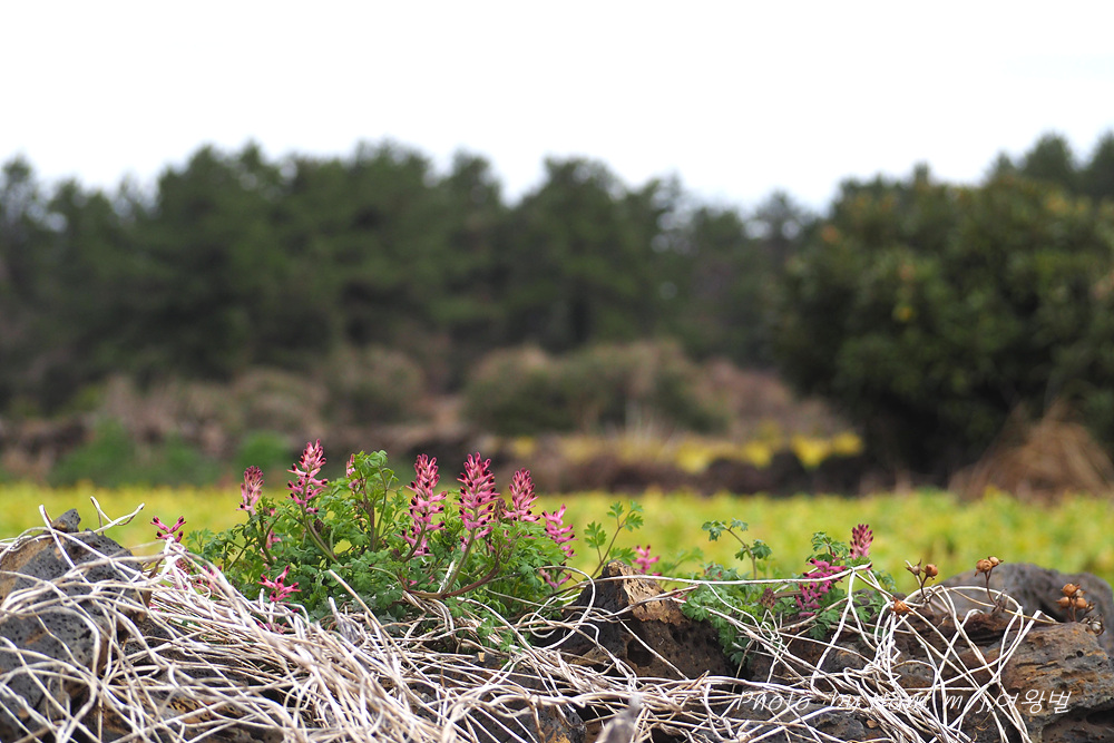 경작지 경계석 현무암 돌담 위로 붉은 꽃을 피우기 시작하는 둥근빗살괴불주머니