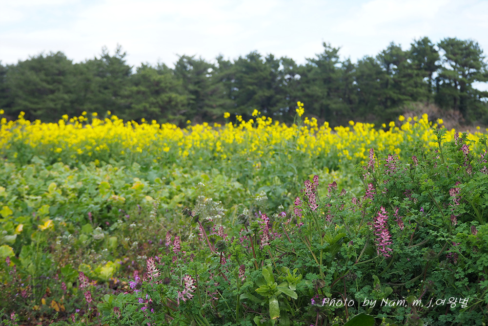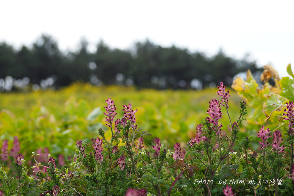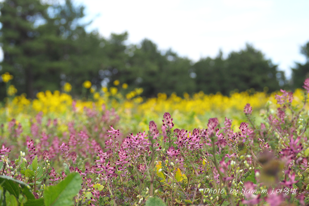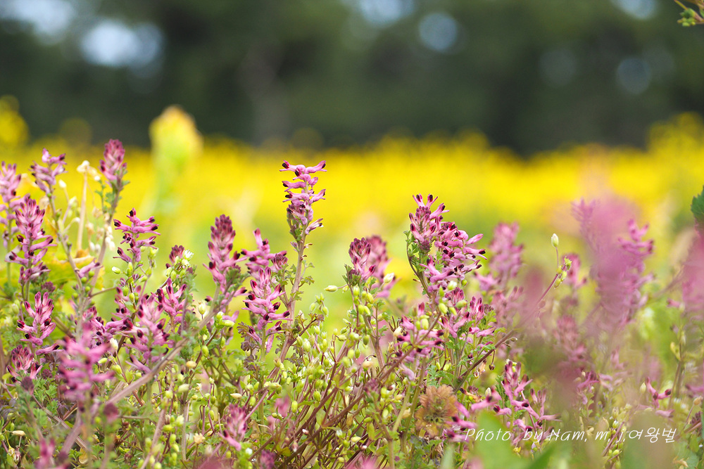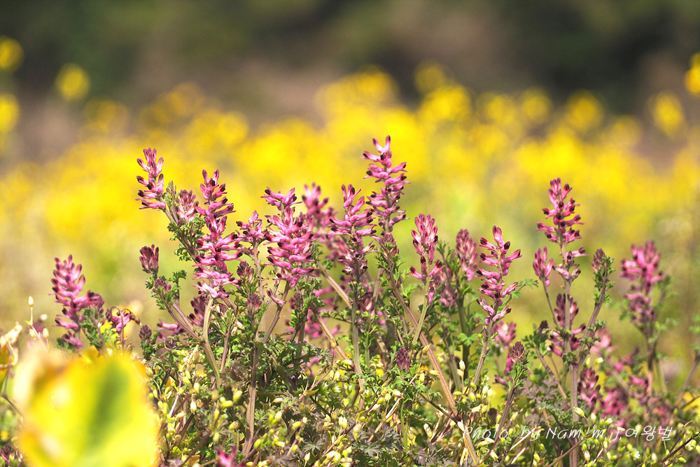 유채꽃을 배경으로 피어 있는둥근빗살괴불주머니의 자태가 그림같다.