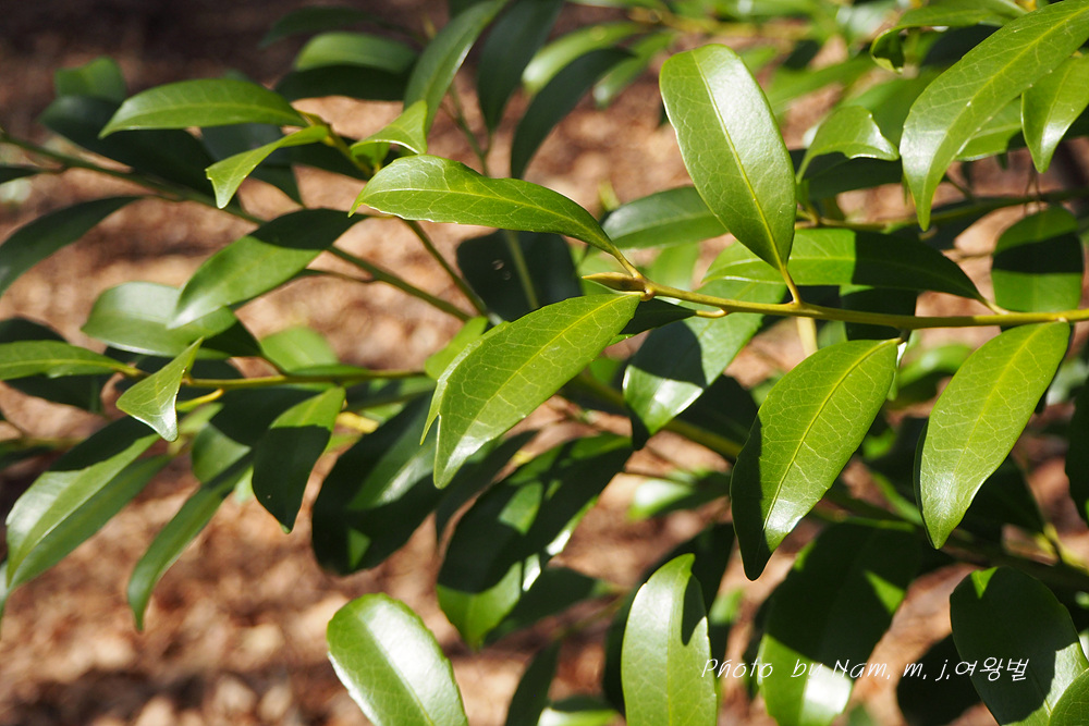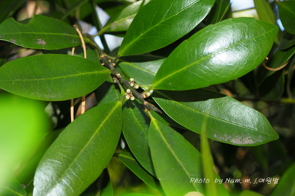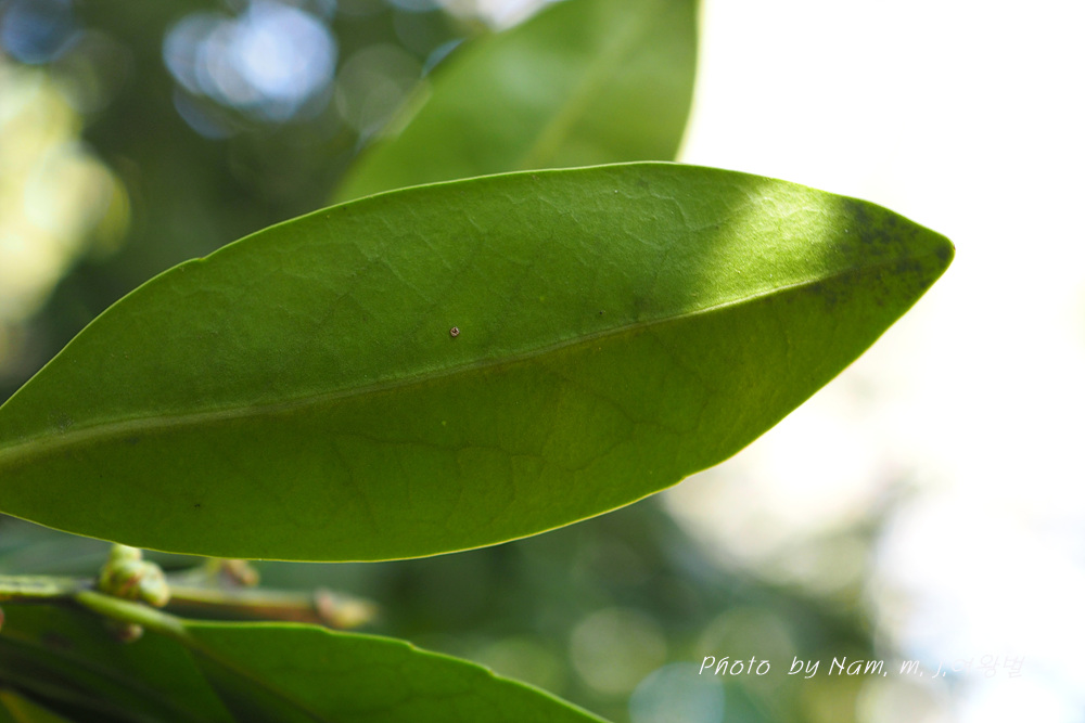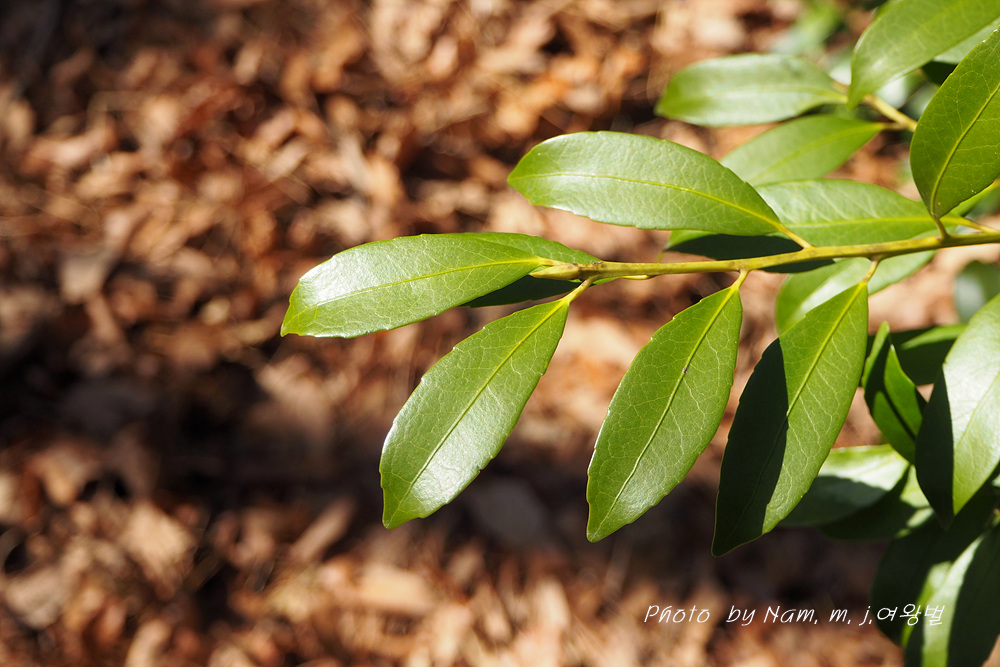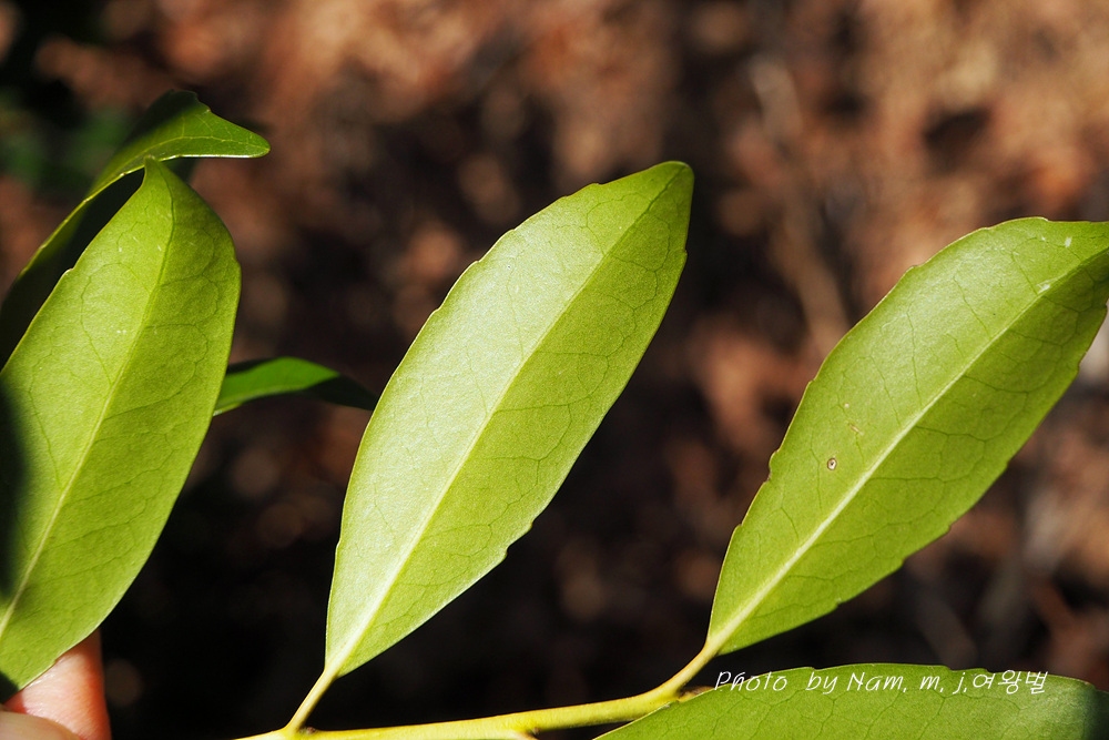 | 꽃은 3∼4월에 흰색으로 피고 묵은 가지의 잎겨드랑이에 2∼3개씩 모여 달리며 꽃대가 없다. 씨방은 3실이다. 잎은 어긋나고 장 타원형으로서 딱딱하며 윤이 나고 엽병이 있다. 가장자리는 밋밋하지만 때로 물결 모양의 톱니가 있다. 열매는 긴 타원형이며 10∼11월에 검게 익는다. 수피는 잿빛을 띤 검은색으로 평평하다. |