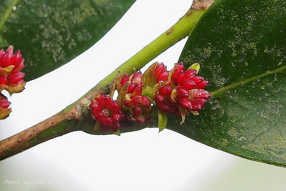 수술은 6-8개이며 꽃밥은 적색이고 암술은 수꽃에서는 퇴화되며 양성화에 1개 있고