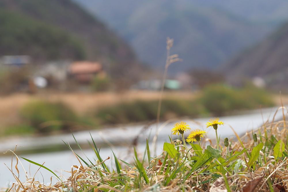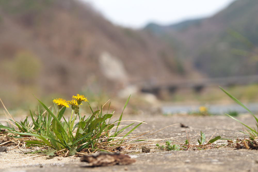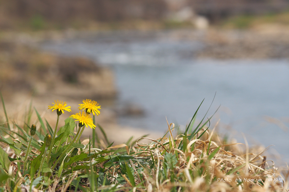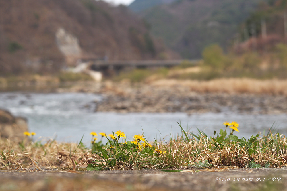 예상했던 대로 강변을 따라 노랗게 피어 있는 산민들레가 밝은 햇살을 받으면서 반겨준다.
