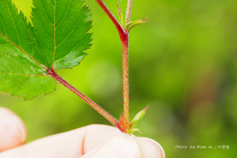 잎자루와 줄기에는 붉은 선모가 많고 드물게 굽은 가시가 있다.