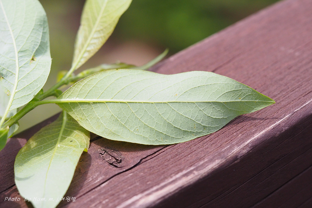 호랑버들처럼 잎가장자리에 톱니가 없지만 호랑버들보다 잎이 약간 좁고 잎 표면도 더 매끈하다.