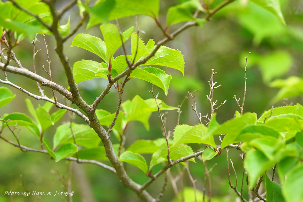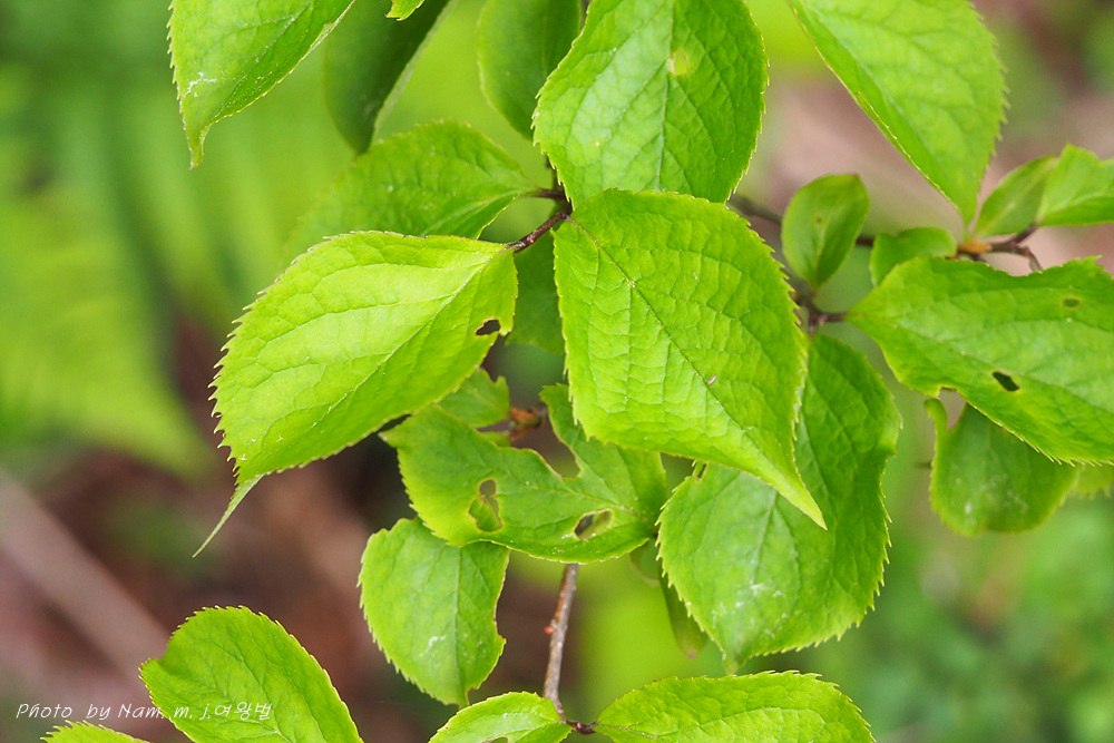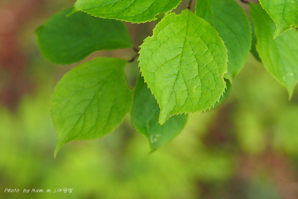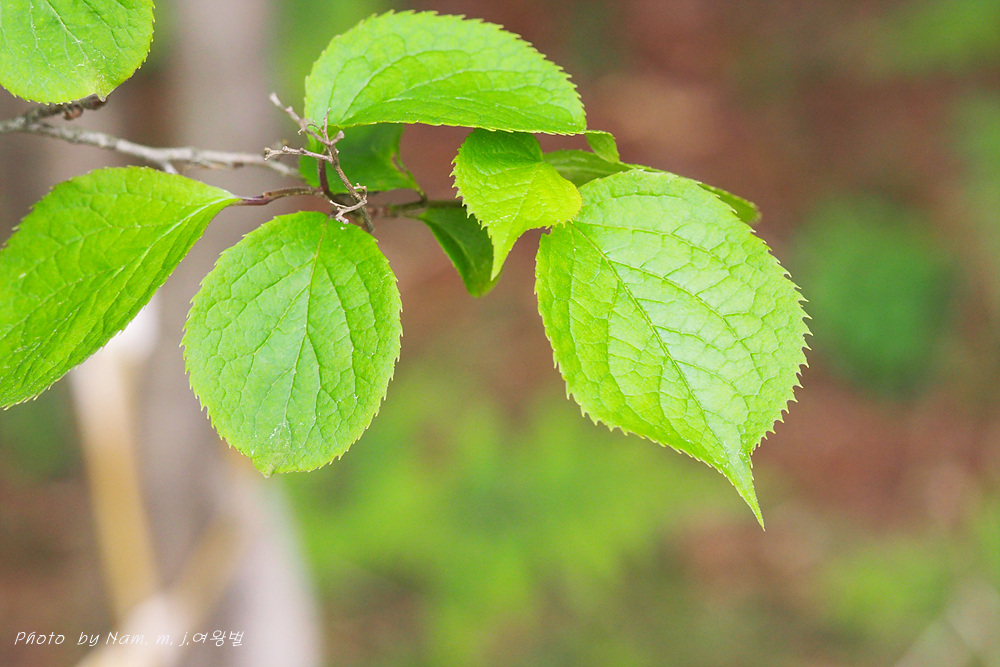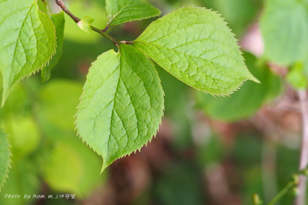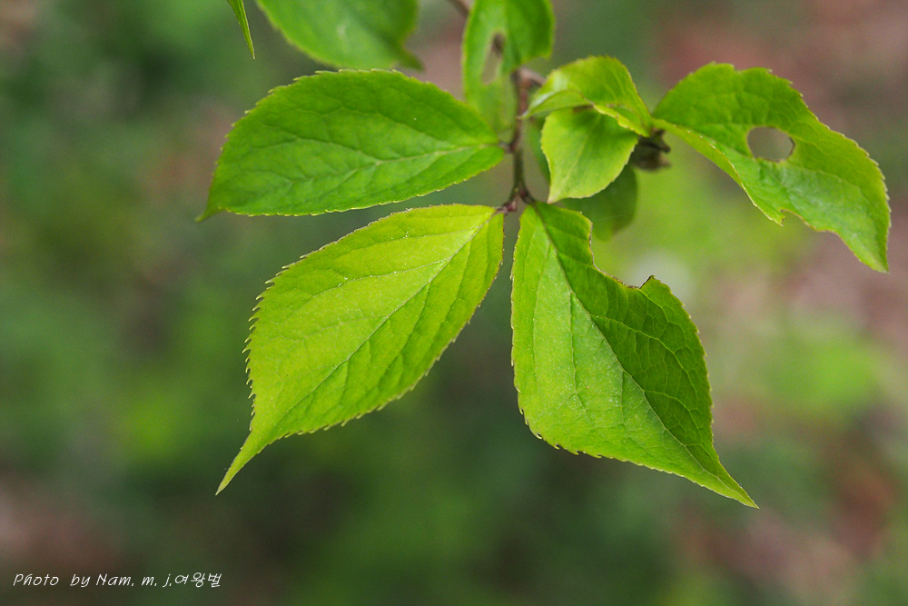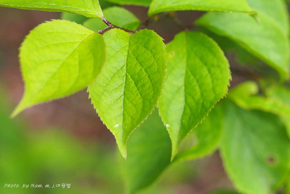 잎 끝이 꼬리처럼 길게 빠져 있고 거치가 날카롭다.