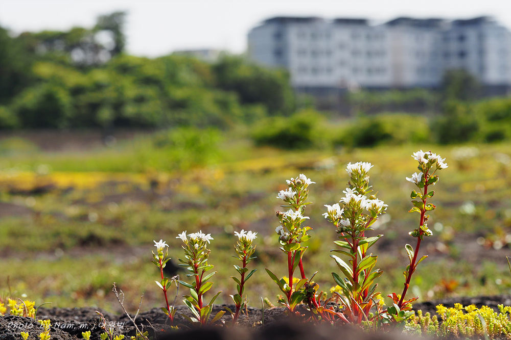 현무암 암반 위에 터잡은 갯까치수염으로 한참 잘 놀았다.