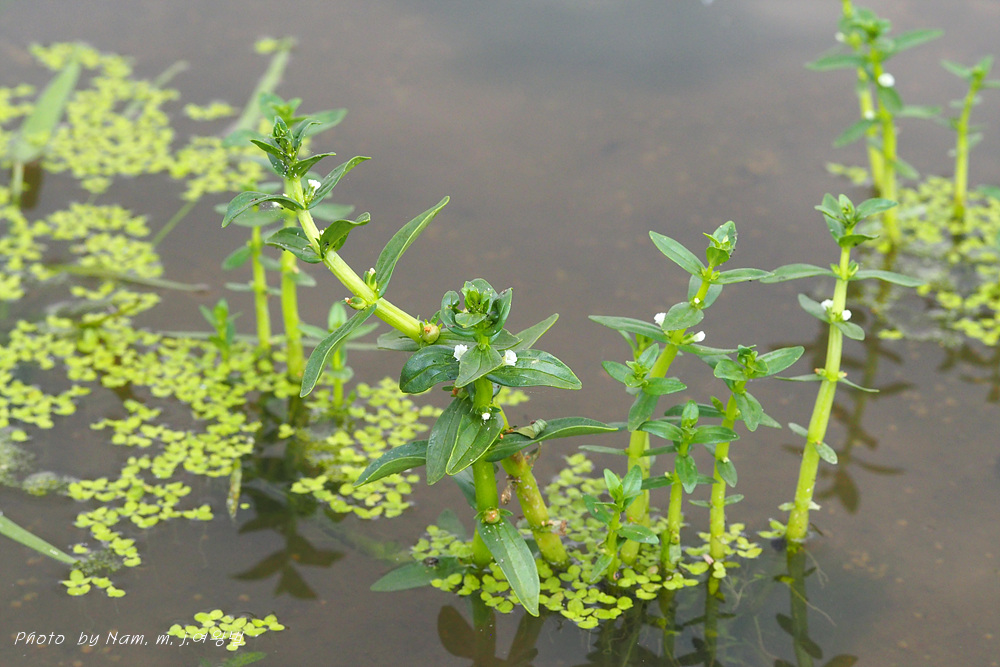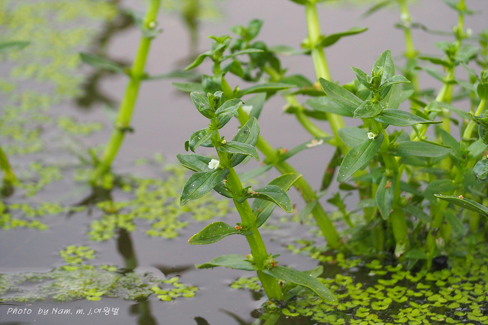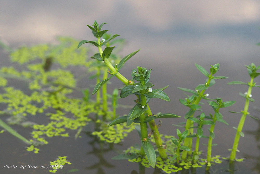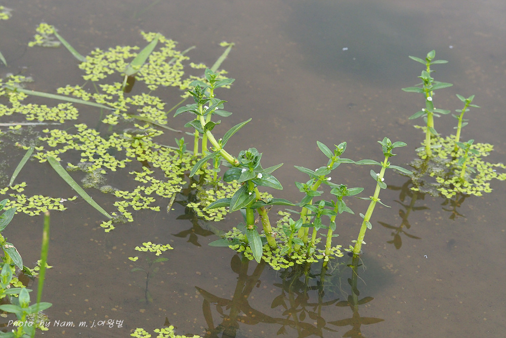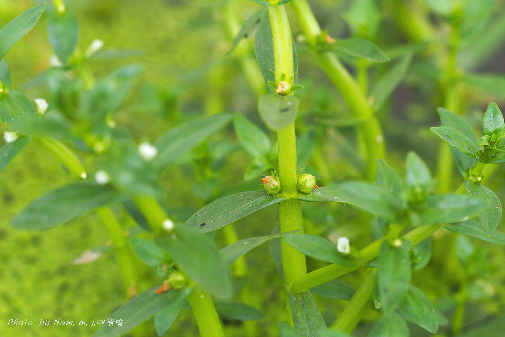 | 논이나 물가에서 자라는 한해살이풀이다. 줄기는 곧추서거나 비스듬히 자라며, 높이 10~25cm, 밑에서 가지를 친다. 잎은 마주나며, 긴 타원형으로 길이 10~23mm, 폭 2~7mm, 밑부분은 줄기를 조금 감싸며, 끝은 뾰족하고, 가장자리는 밋밋하다. 잎자루는 없다. 꽃은 8~9월에 흰색으로 피며, 잎겨드랑이에 1개씩 달린다. 꽃받침은 길이 3~4mm, 5갈래로 깊게 갈라지며, 갈래조각은 피침형, 가장자리는 막질이다. 꽃부리는 입술 모양이며, 길이 6mm, 5갈래로 갈라진다. 수술은 통부에 2개가 달리며, 2개의 퇴화한 수술이 있다. 열매는 둥근 삭과로 지름 4~5mm다. 우리나라 전역에 나며, 러시아 동부, 일본, 중국 등에 분포한다. |