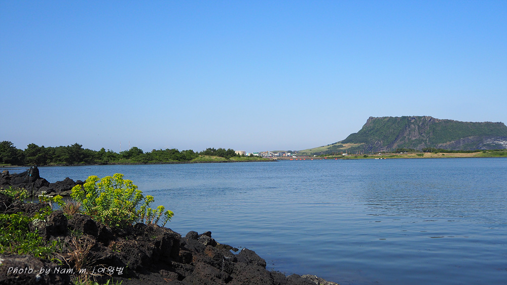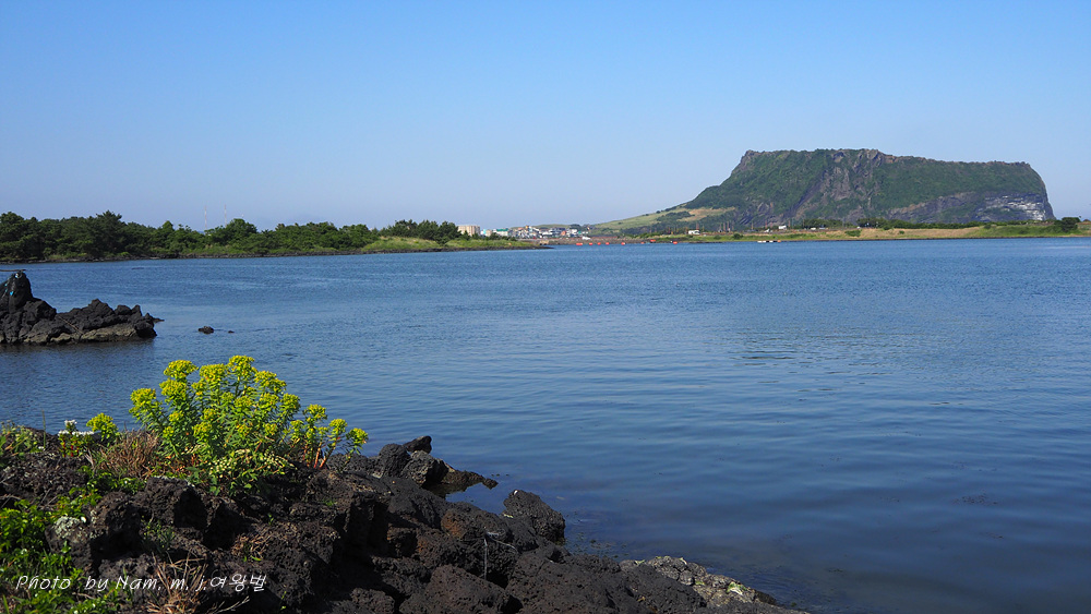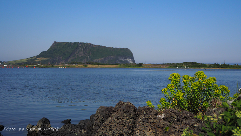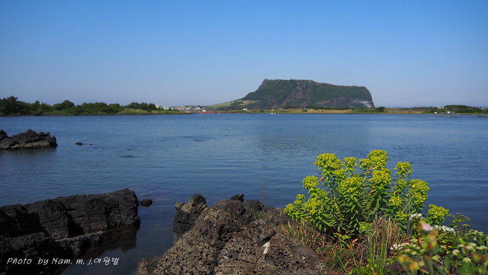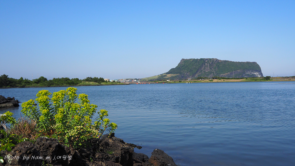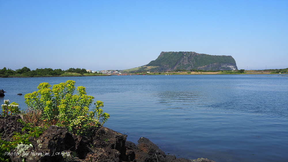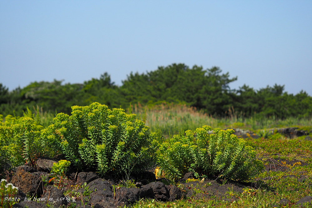 해안 현무암 암반에 자리 잡은 암대극이 성산 일출봉을 배경으로 멋진 그림을 그려주고 있다.