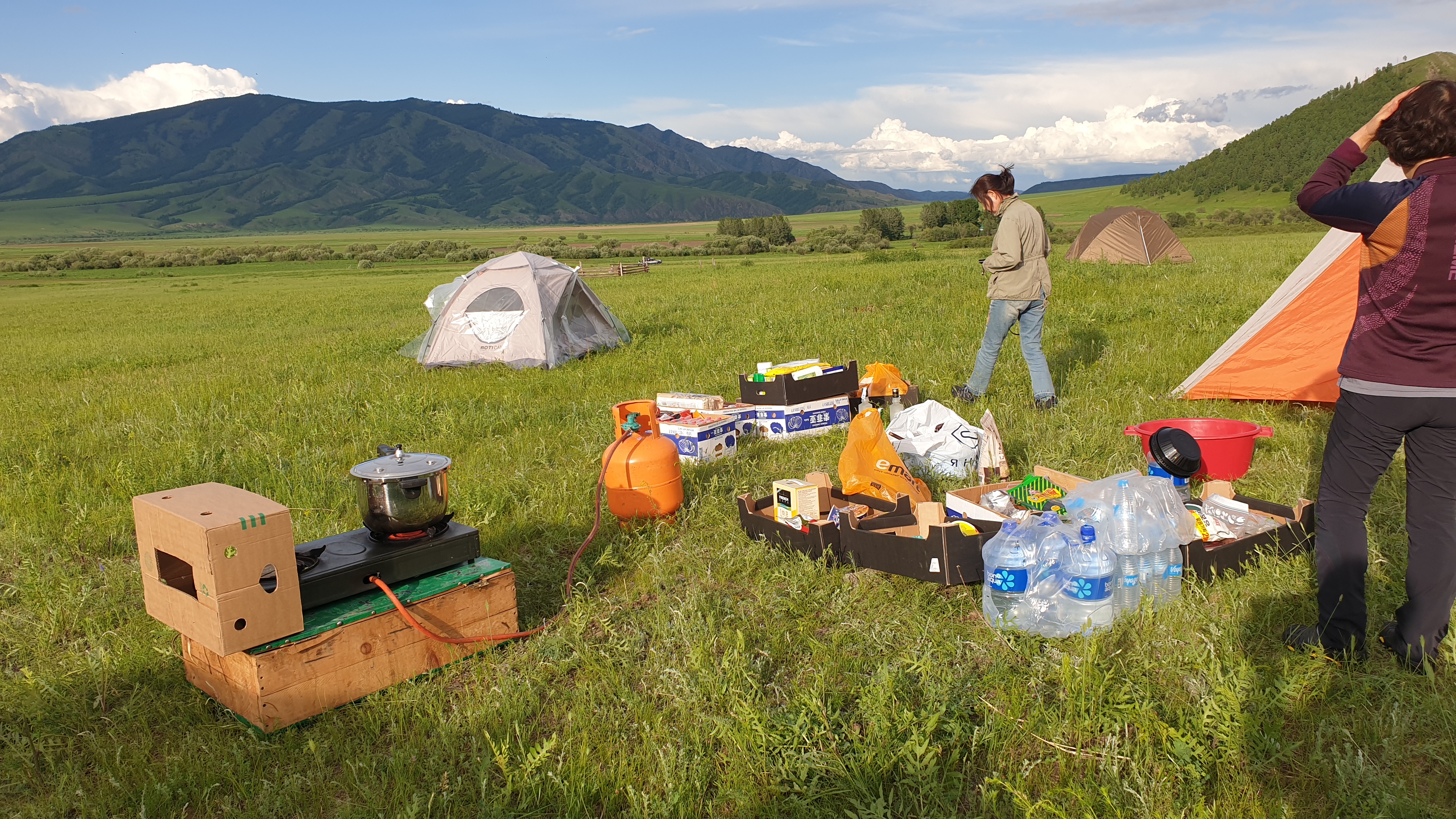 한쪽에서는 텐트를 설치하는데 여자들은 저녁밥을 짓느라고 야외 주방에서 분주하다.
