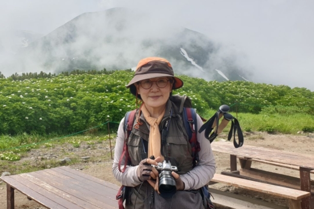 남명자 전 교장. 닉네임이 '여왕벌'이다. 지난 7월 일본 홋카이도 대설산 탐사할 때 사진이다. /남명자 전 교장 제공