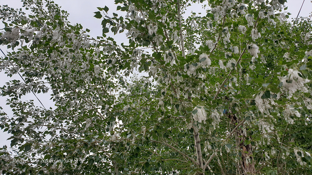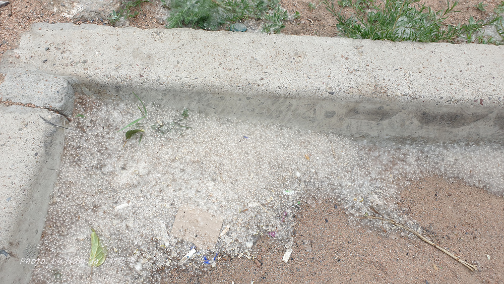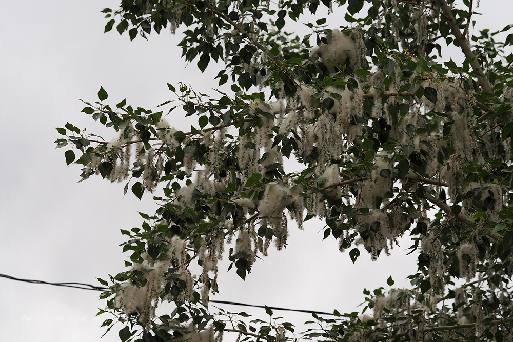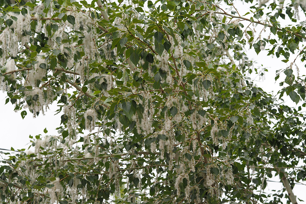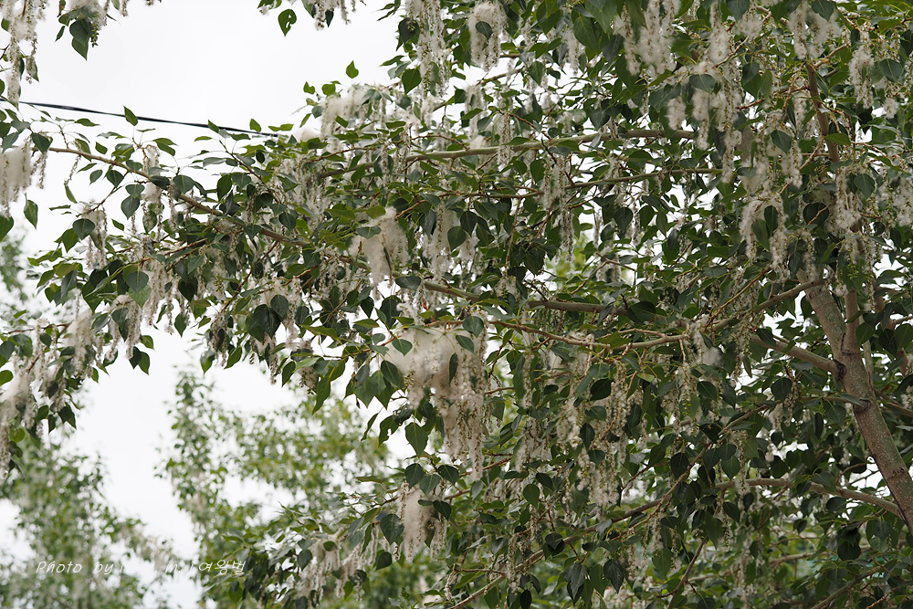 열매가 터져서 날아다니며 길바닥에 눈이 온 듯 하얗게 덮고 있다.