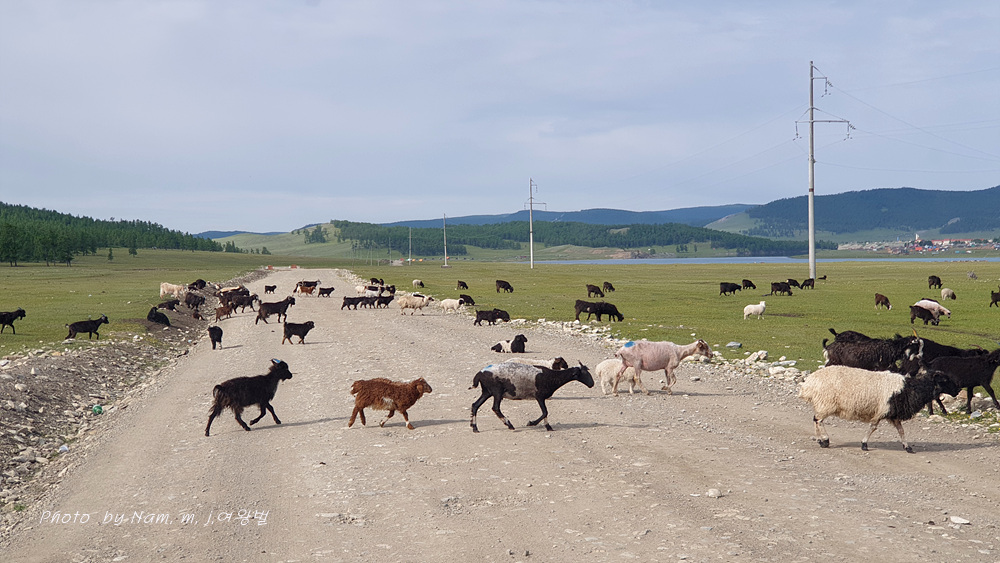 좌우 초지에서 풀을 뜯던 가축들이 도로를 건너는 행렬에 잠지 길을 멈춘다.