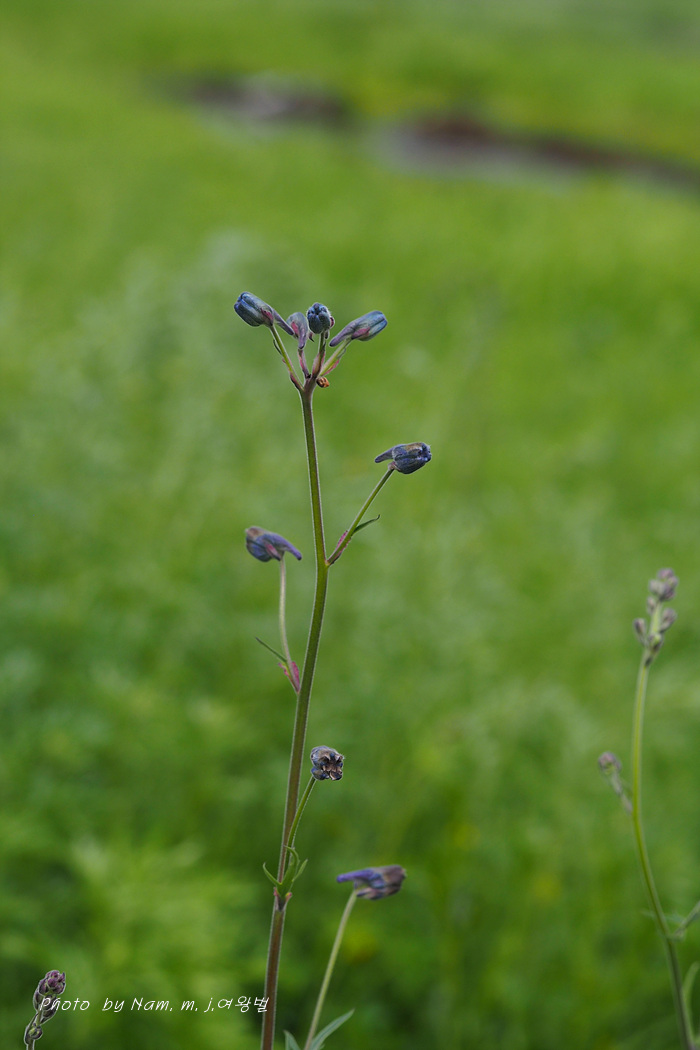 아직 봉오리 상태라 아쉽다. 제비고깔속 Delphinium triste 였다.