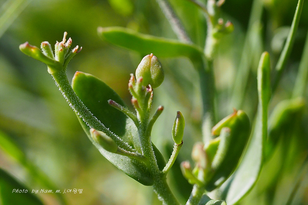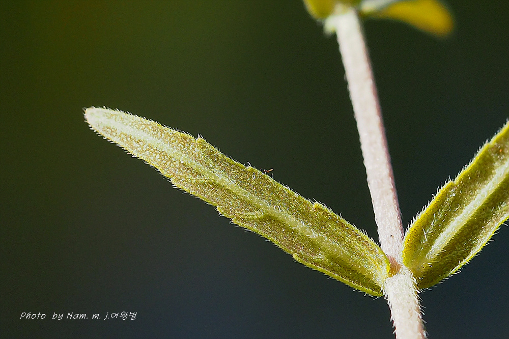 엽질이 두텁고 엽저가 줄기를 싸듯이 하며, 줄기와 화서에 짧은 털이 밀생한다.