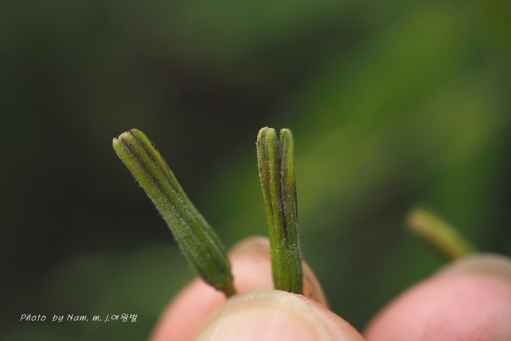 길이 10mm 정도의 5개의 내총포와 그 아래 아주 짧은 외총포, 총포편에는 털이 밀생한다.