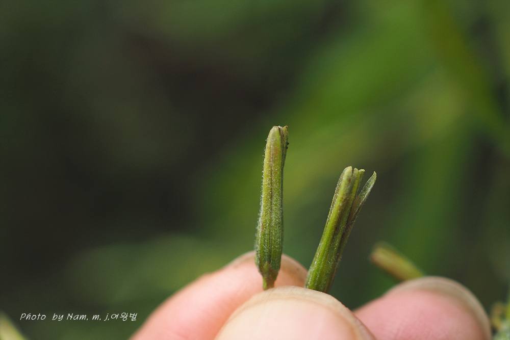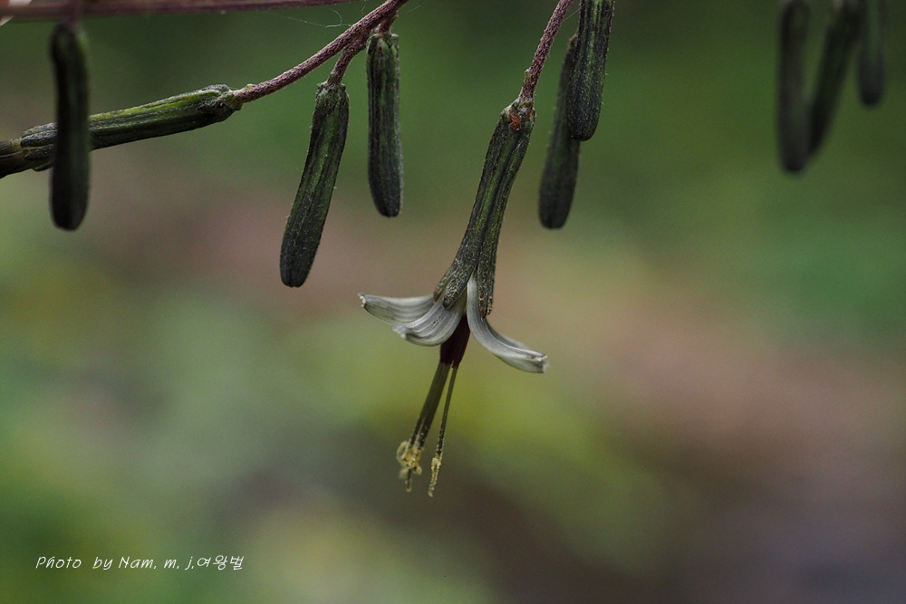 꽃은 아래로 늘어지고 길이 10mm의 연보라색 설상화가 5 ~6개 있고 총포 길이 10~14mm,로 총포조각은 2줄로 붙는다.