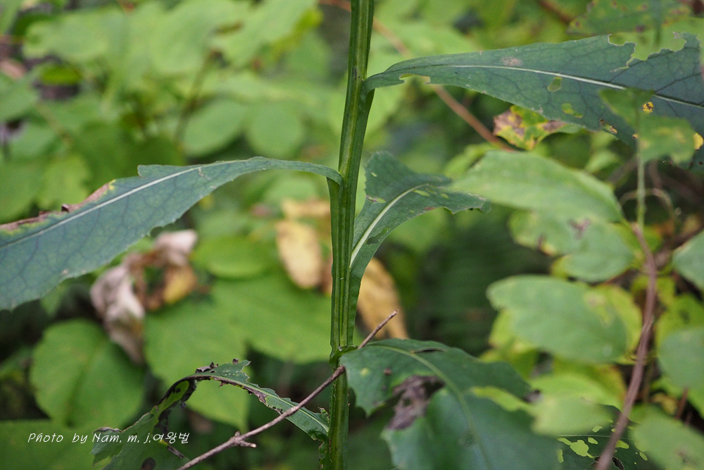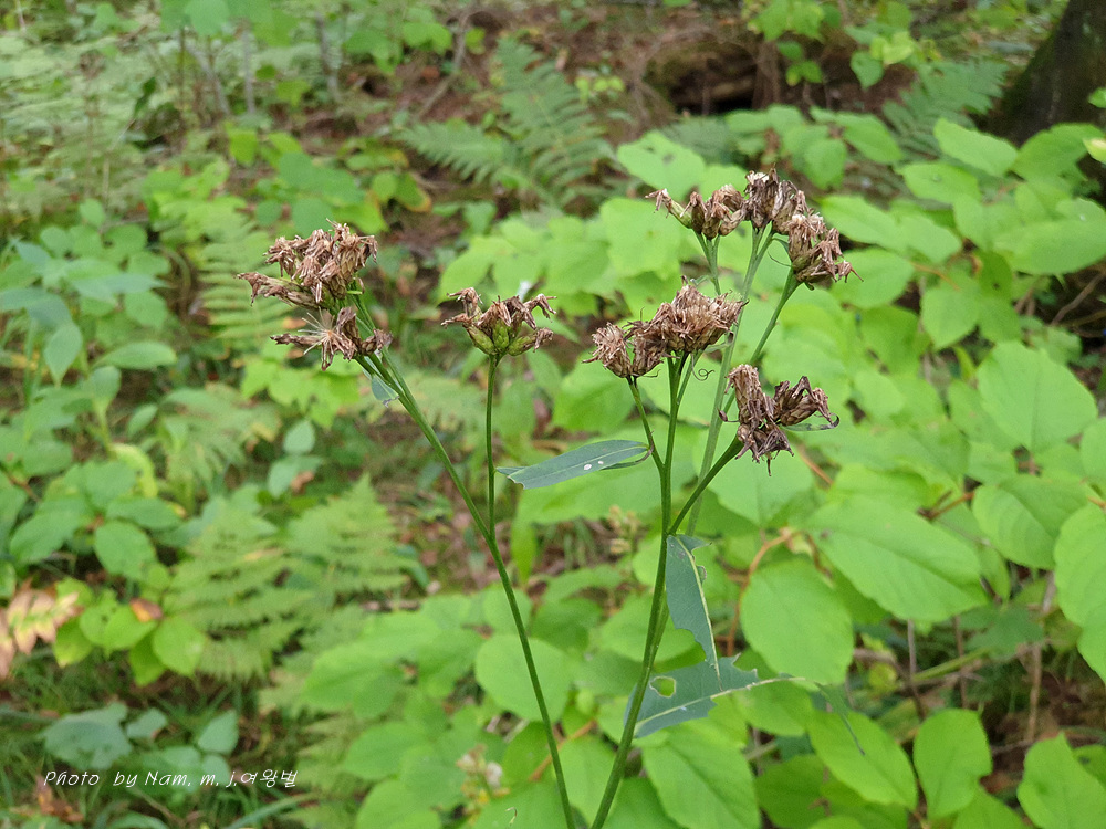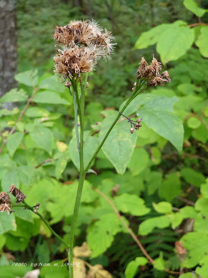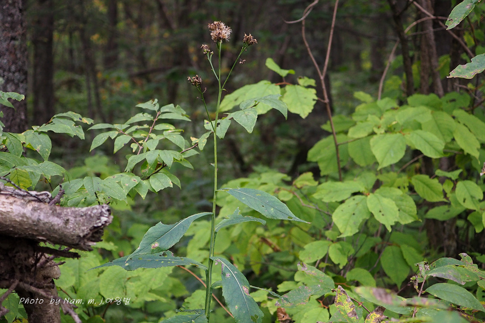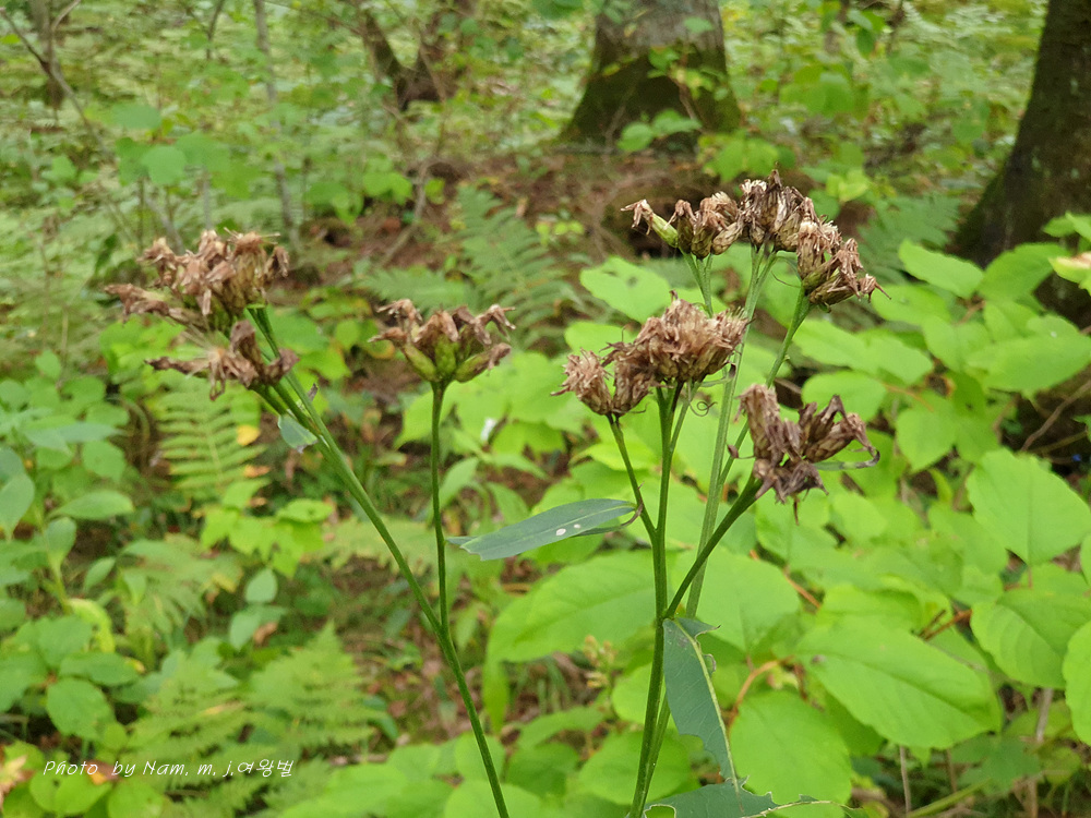 | 높은 지대의 들판, 산기슭 덤불숲 등에 자라는 여러해살이풀이다. 줄기는 곧게 자라며 높이 30~100cm, 위쪽에서 가지가 갈라지고 좁은 날개가 있으며 털이 거의 없다. 뿌리잎은 모여나며 잎자루는 길이 2~3cm, 꽃이 필 때 거의 시든다. 줄기잎은 어긋나며 잎몸은 넓은 피침형으로 길이 12~20cm, 폭 4~8cm, 밑부분은 쐐기 모양으로 좁아지고 끝은 뾰족하며, 가장자리에 뾰족한 톱니가 있다. 잎 뒷면에 꼬부라진 흰 털이 있다. 머리모양꽃은 8~9월에 자주색으로 피며, 지름 8~10mm, 줄기 끝에 빽빽하게 달려서 전체가 산방꽃차례를 이룬다. 모인꽃싸개는 통 모양으로 길이 8~9mm, 지름 4~5mm, 조각은 4~6줄로 붙는다. 열매는 수과로 기둥 모양, 길이 5mm쯤이다. 우산털은 2줄로 붙으며, 바깥쪽 털은 길이 1~2mm, 안쪽 털은 길이 6~7mm이다. 우리나라 북부지방에 나며, 러시아 동시베리아, 몽골, 중국 동북부 등에 분포한다. |