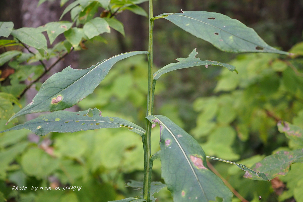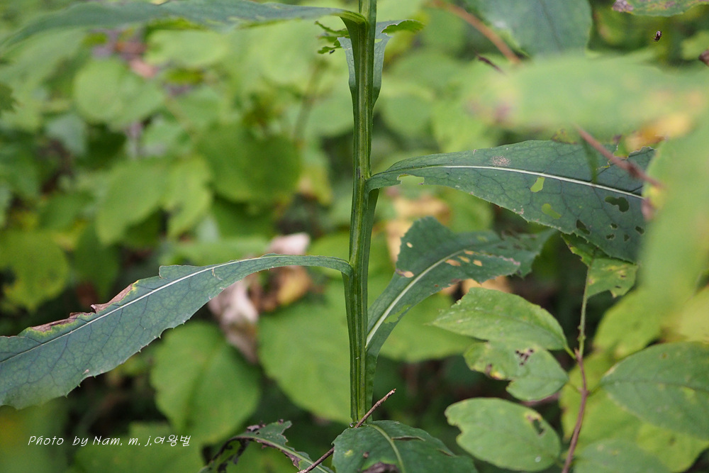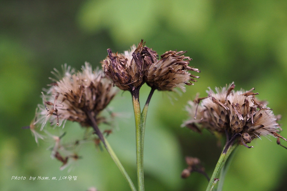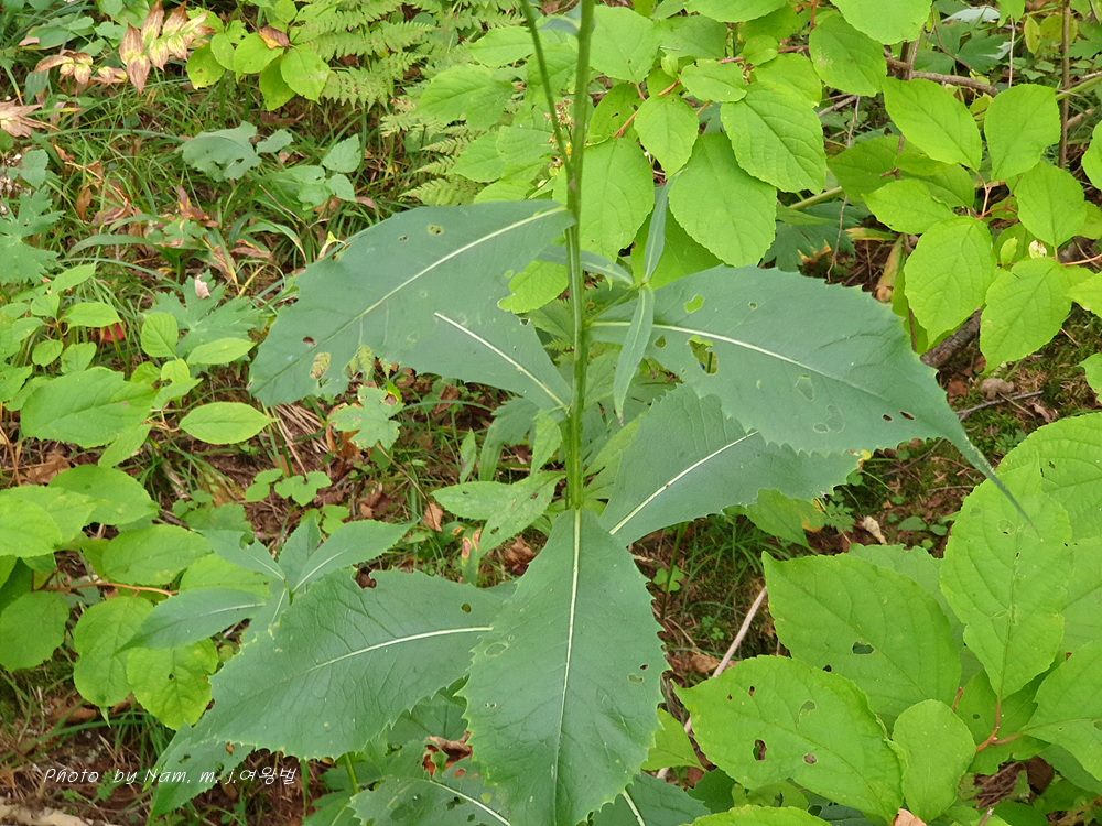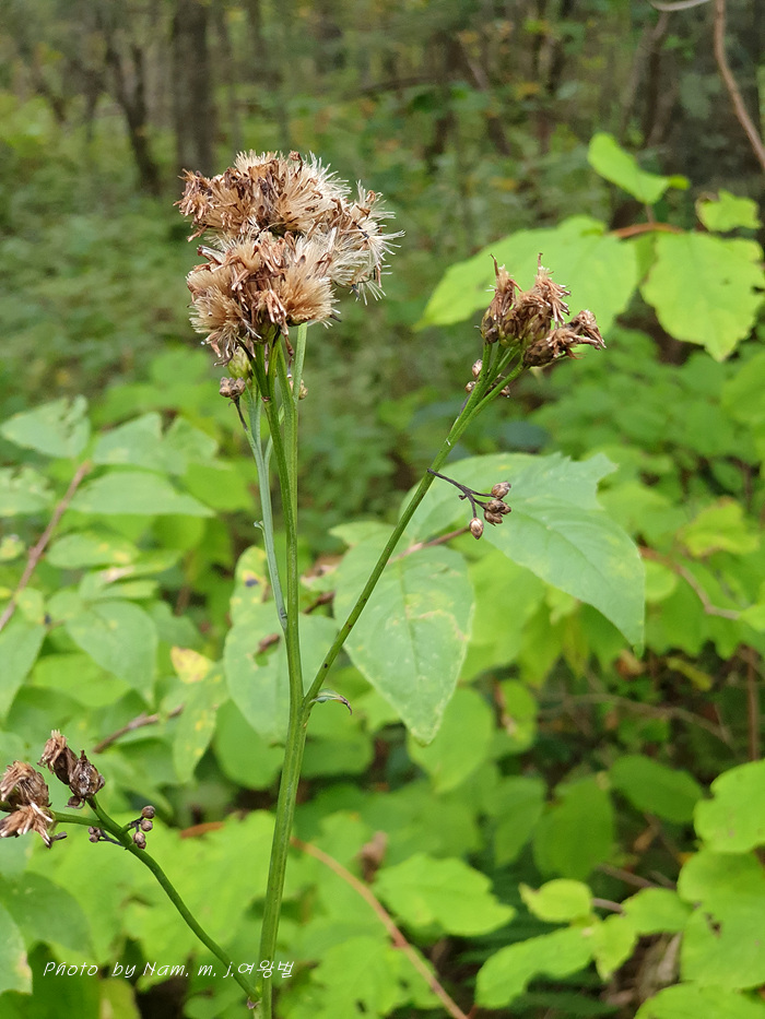 | 높은 지대의 들판, 산기슭 덤불숲 등에 자라는 여러해살이풀이다. 줄기는 곧게 자라며 높이 30~100cm, 위쪽에서 가지가 갈라지고 좁은 날개가 있으며 털이 거의 없다. 뿌리잎은 모여나며 잎자루는 길이 2~3cm, 꽃이 필 때 거의 시든다. 줄기잎은 어긋나며 잎몸은 넓은 피침형으로 길이 12~20cm, 폭 4~8cm, 밑부분은 쐐기 모양으로 좁아지고 끝은 뾰족하며, 가장자리에 뾰족한 톱니가 있다. 잎 뒷면에 꼬부라진 흰 털이 있다. 머리모양꽃은 8~9월에 자주색으로 피며, 지름 8~10mm, 줄기 끝에 빽빽하게 달려서 전체가 산방꽃차례를 이룬다. 모인꽃싸개는 통 모양으로 길이 8~9mm, 지름 4~5mm, 조각은 4~6줄로 붙는다. 열매는 수과로 기둥 모양, 길이 5mm쯤이다. 우산털은 2줄로 붙으며, 바깥쪽 털은 길이 1~2mm, 안쪽 털은 길이 6~7mm이다. 우리나라 북부지방에 나며, 러시아 동시베리아, 몽골, 중국 동북부 등에 분포한다. |