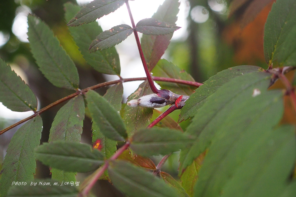 겨울눈에 흰털이 빽빽하게 나고 점성이 없으며 작은 잎 9~15장으로 된 깃꼴겹잎이다.