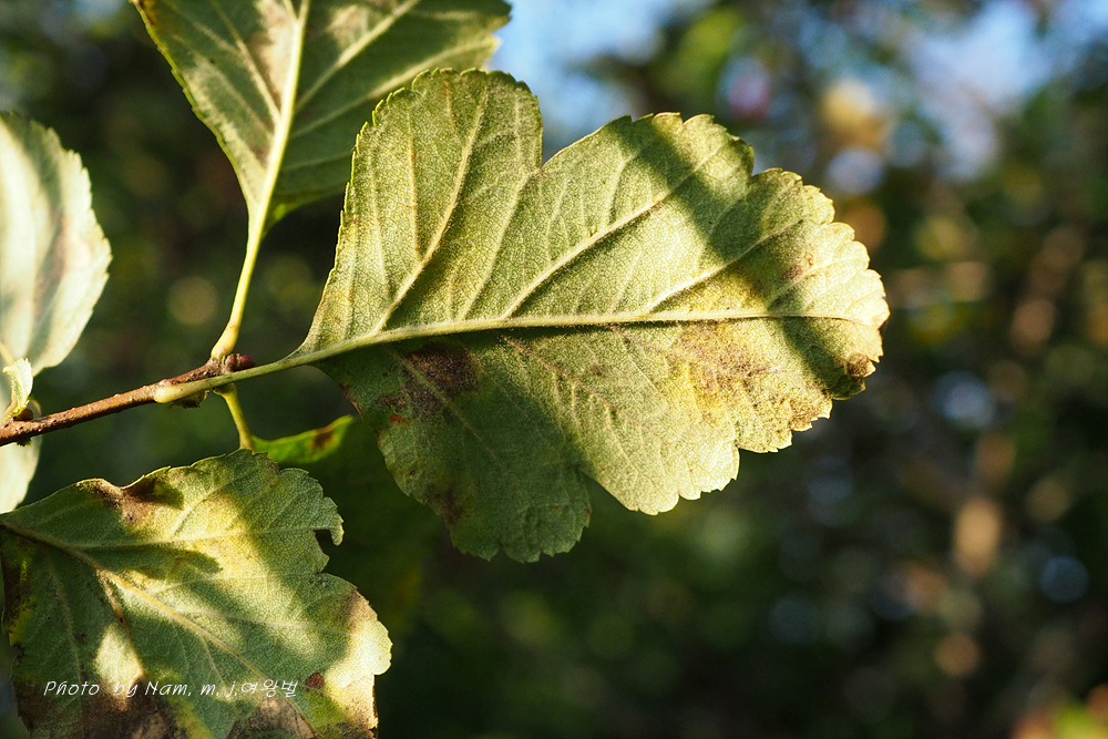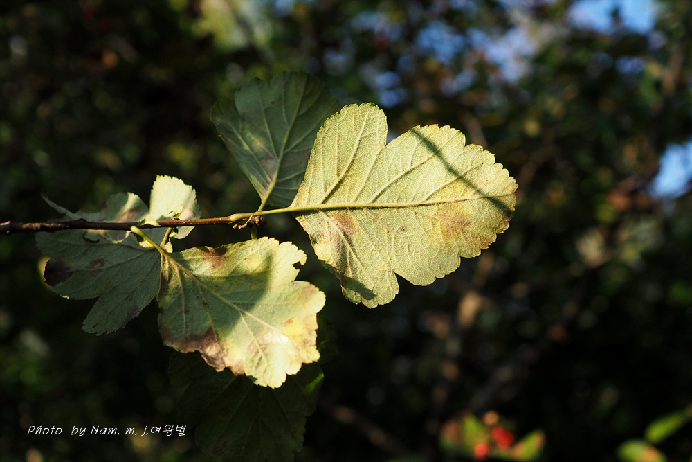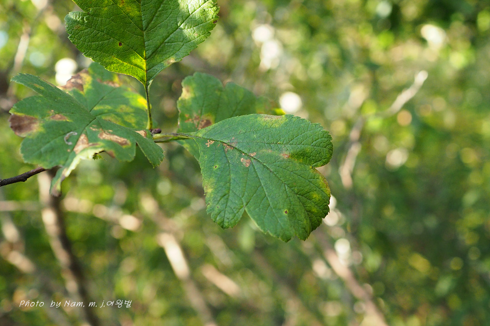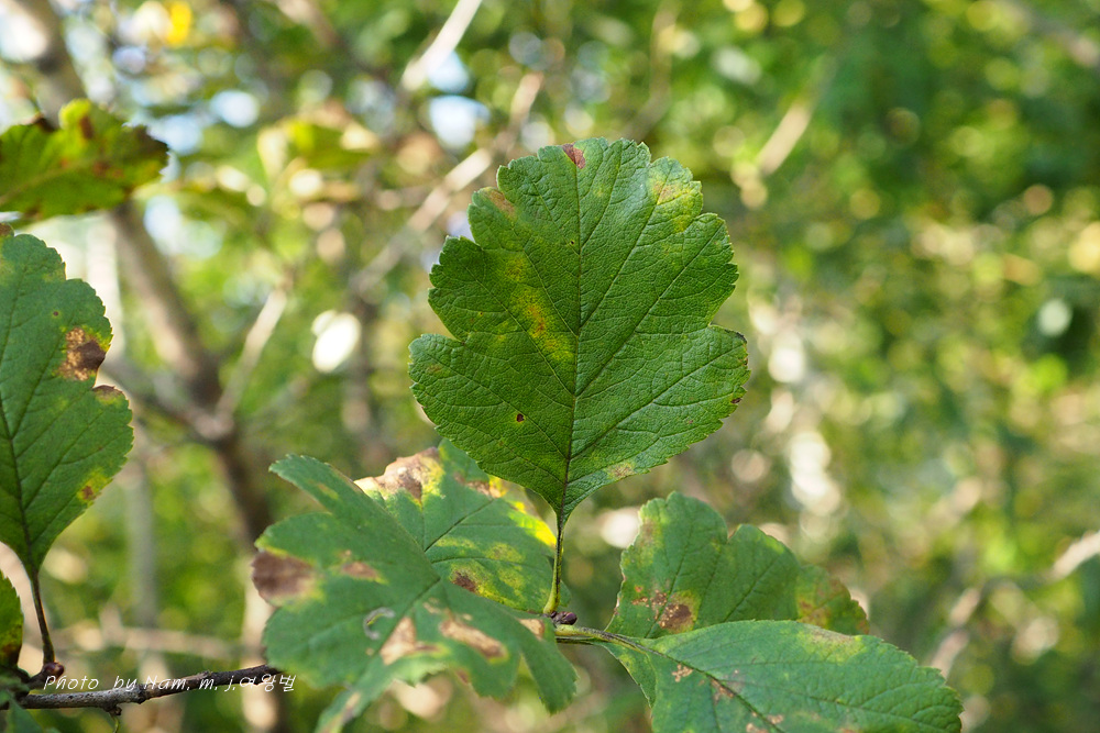 산사나무에 비하여 잎 가장자리에 결각이 얕고 잎 뒷면과 꽃차례에 털이 많다.