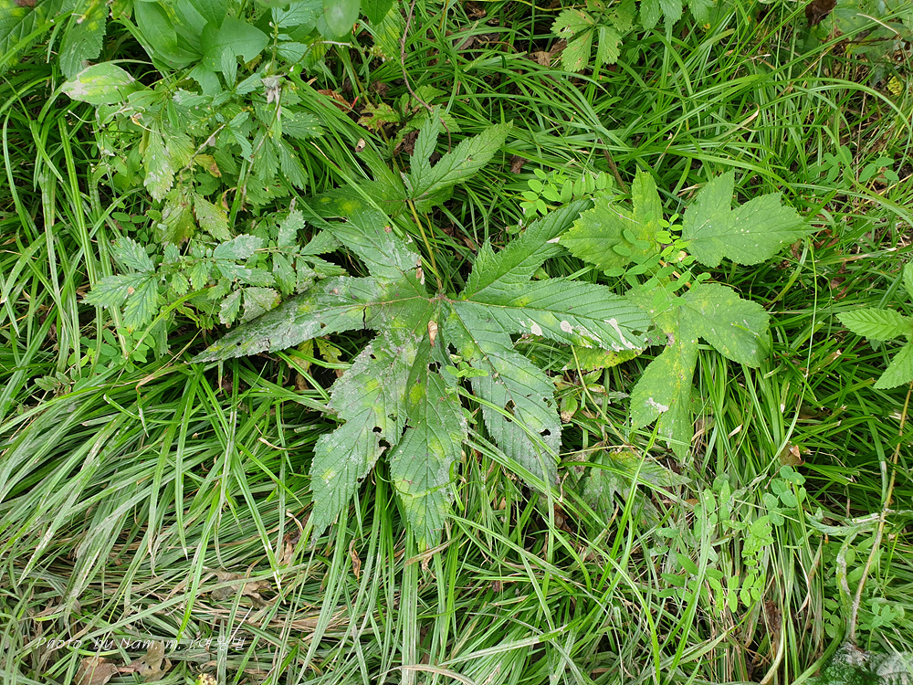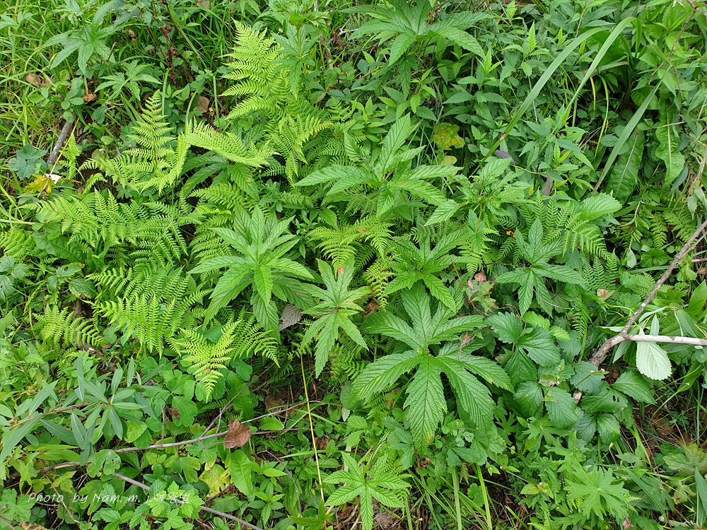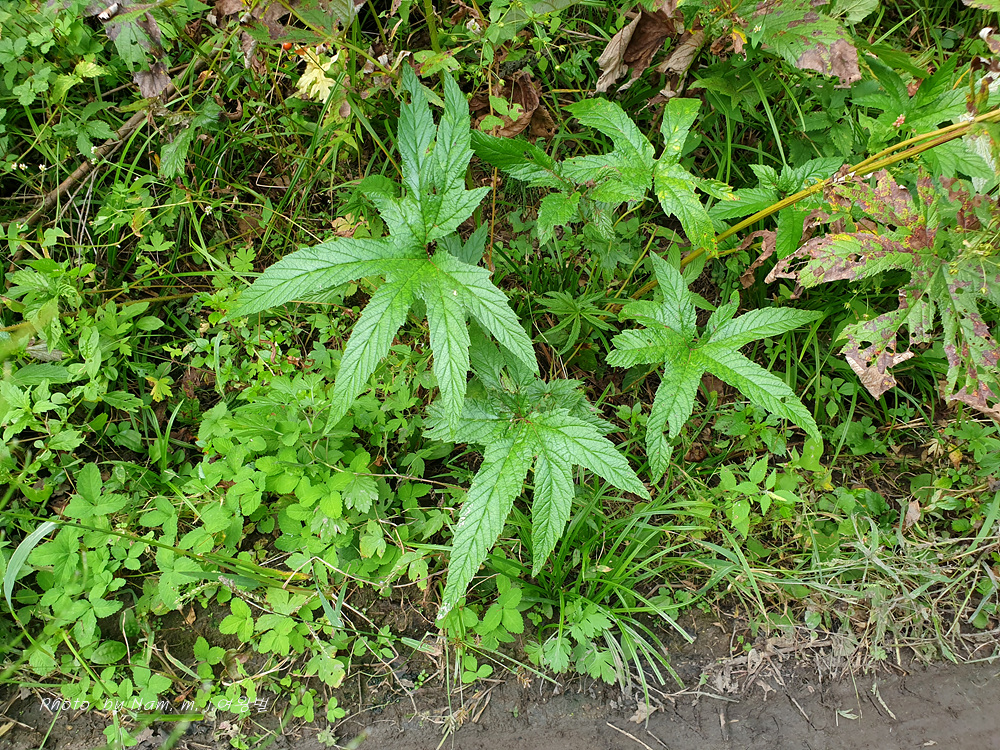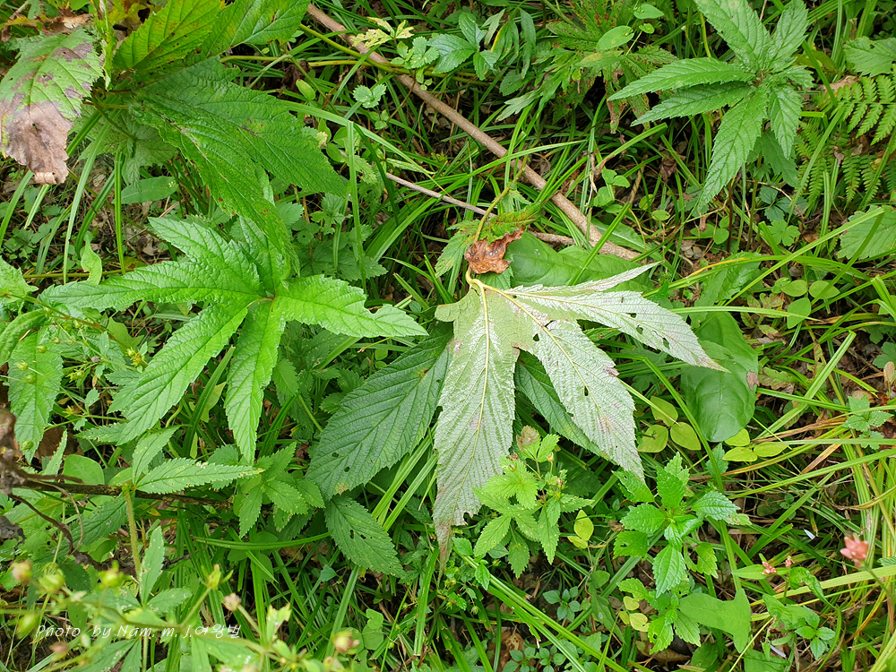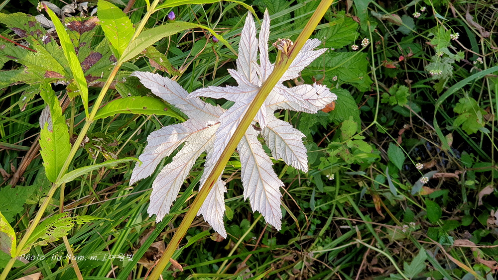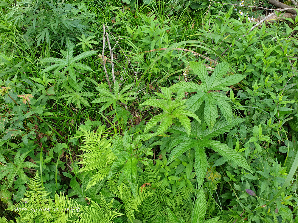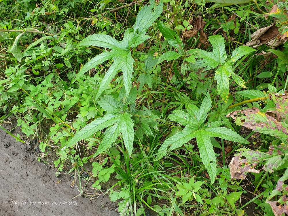잎은 홀수 깃꼴겹잎이며, 끝의 작은잎은 5~7갈래의 손바닥 모양으로 갈라진다.