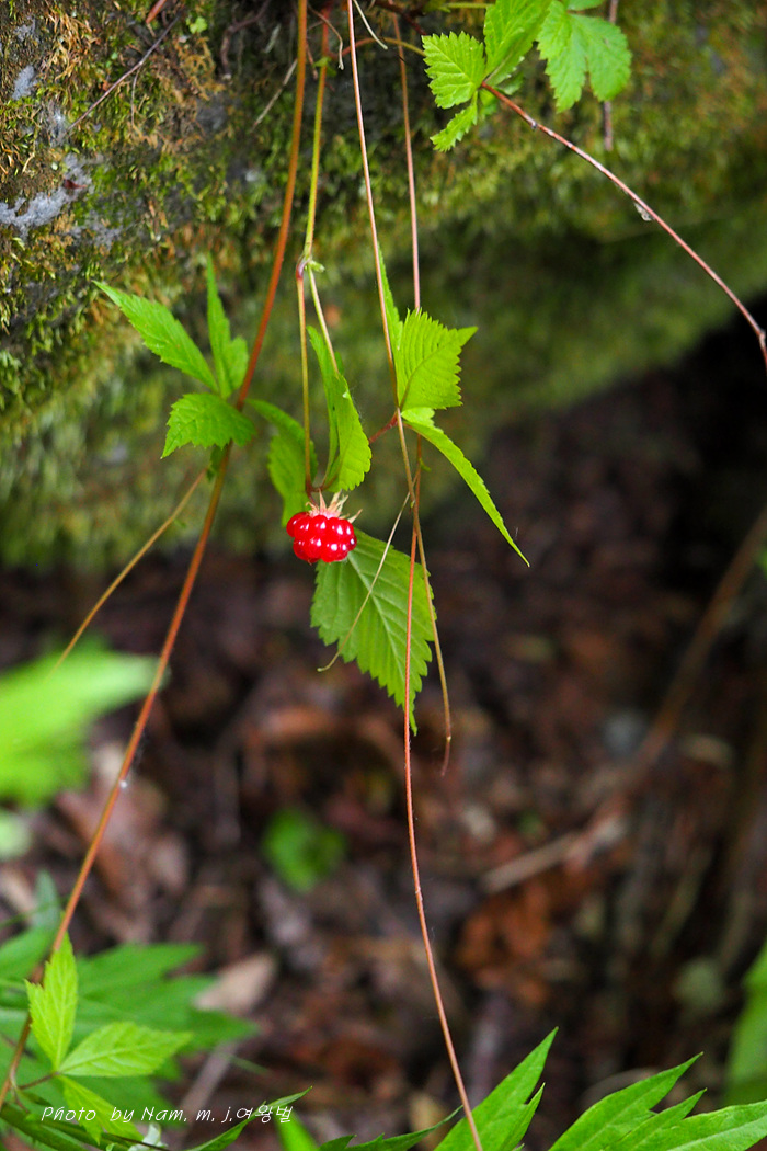 계류 옆 숲에서 본 이 녀석은 줄기가 길게 늘어졌으며 전초에 가시가 없고 잎이 5소엽의 생소한 산딸기속이었다.