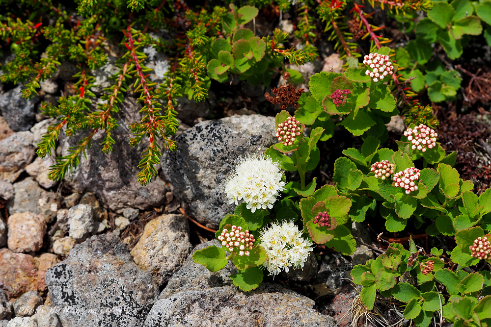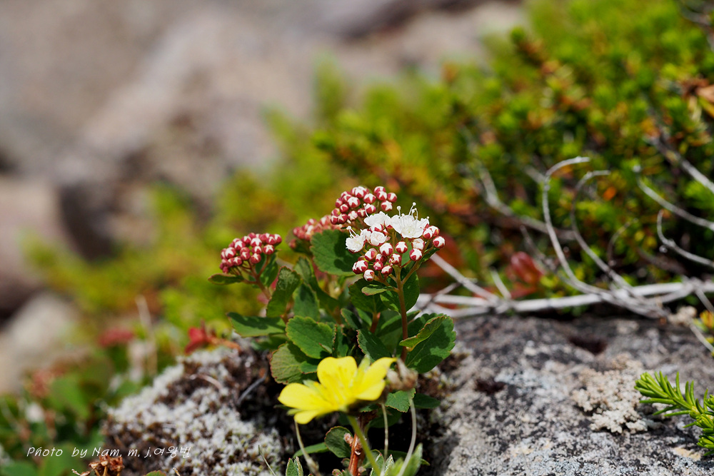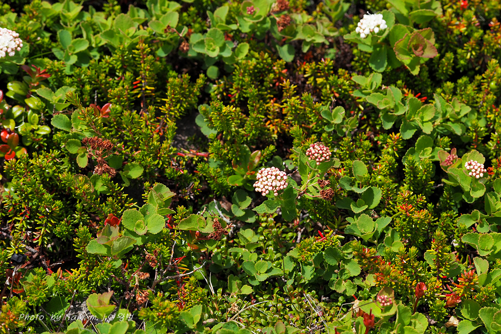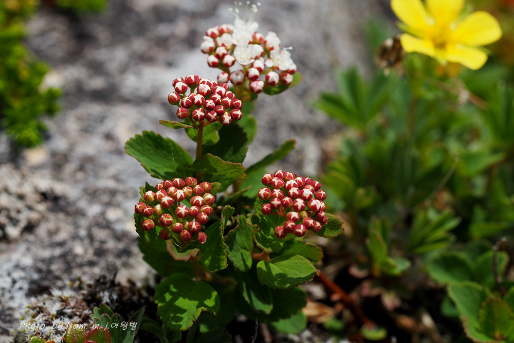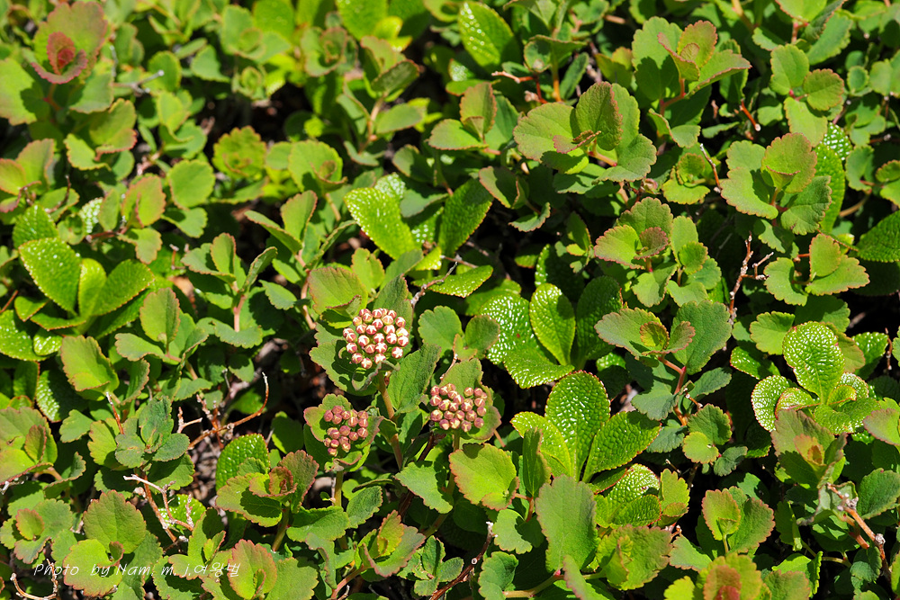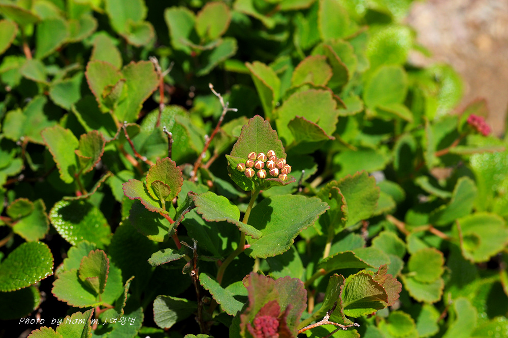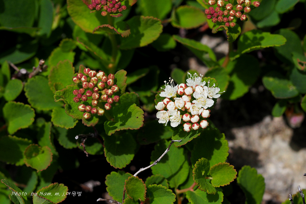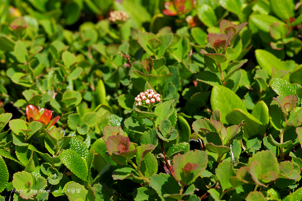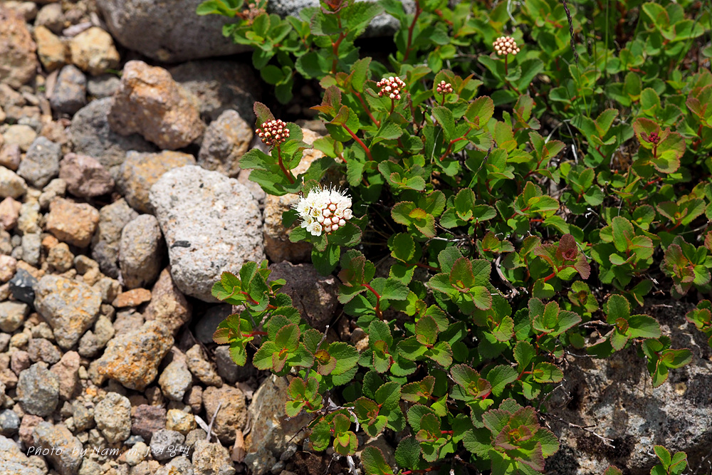 산장으로 내려가는 바위지대 틈새에 동글동글 작은 잎을 달고 있는 관목 조팝나무속 녀석이다