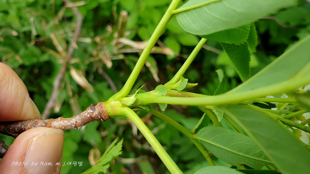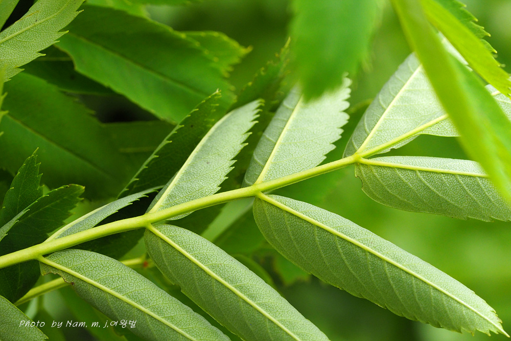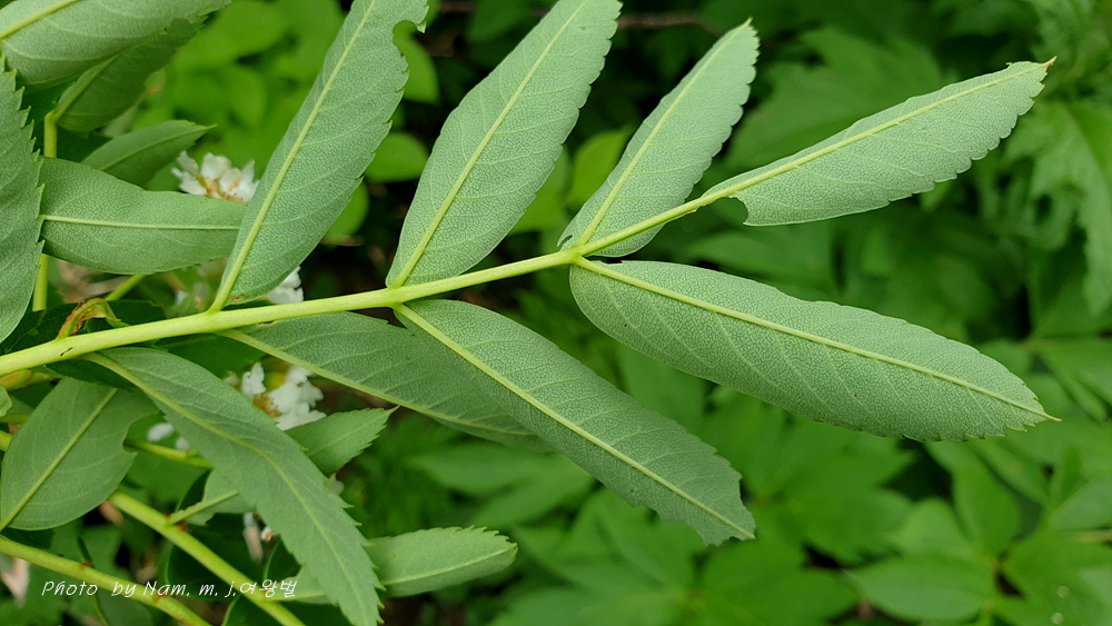 깃꼴잎의 소엽이 4~6쌍, 잎끝이 짧고 상반부에 거치가 있으나 하반부에는 전연으로 거치가 없다.소엽 기부는 뒤틀린 우너형, 뒷면은 분백색이다.