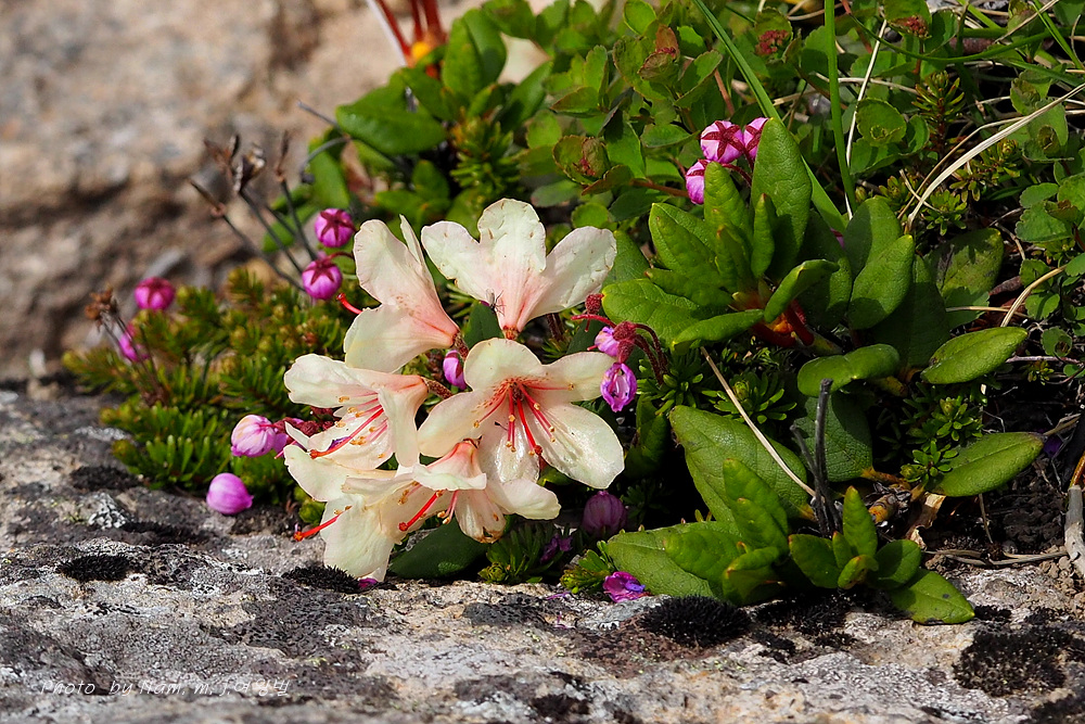 => 노랑만병초의 원본을 모두 살펴 본 결과 엽형이 같고 노랑만병초에도 화관 기부에 약간의 옅은 홍색이 보여서 색의 변이 폭이 있는 노랑만병초로 봐야 할 것 같아서 노랑만병초로 수정한다. 국내의 홍만병초는 왜성 관목이 아니라 2~4m 정도의 관목으로 엽형도 만병초 정도 크기라서 아마도 내가 동정을 잘못한 것 같다.