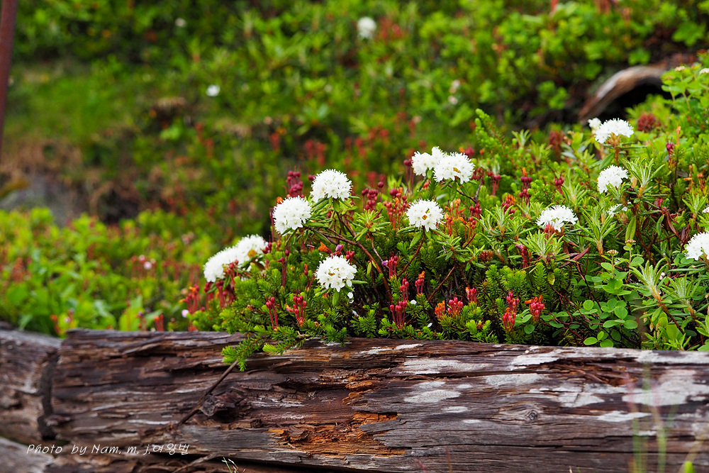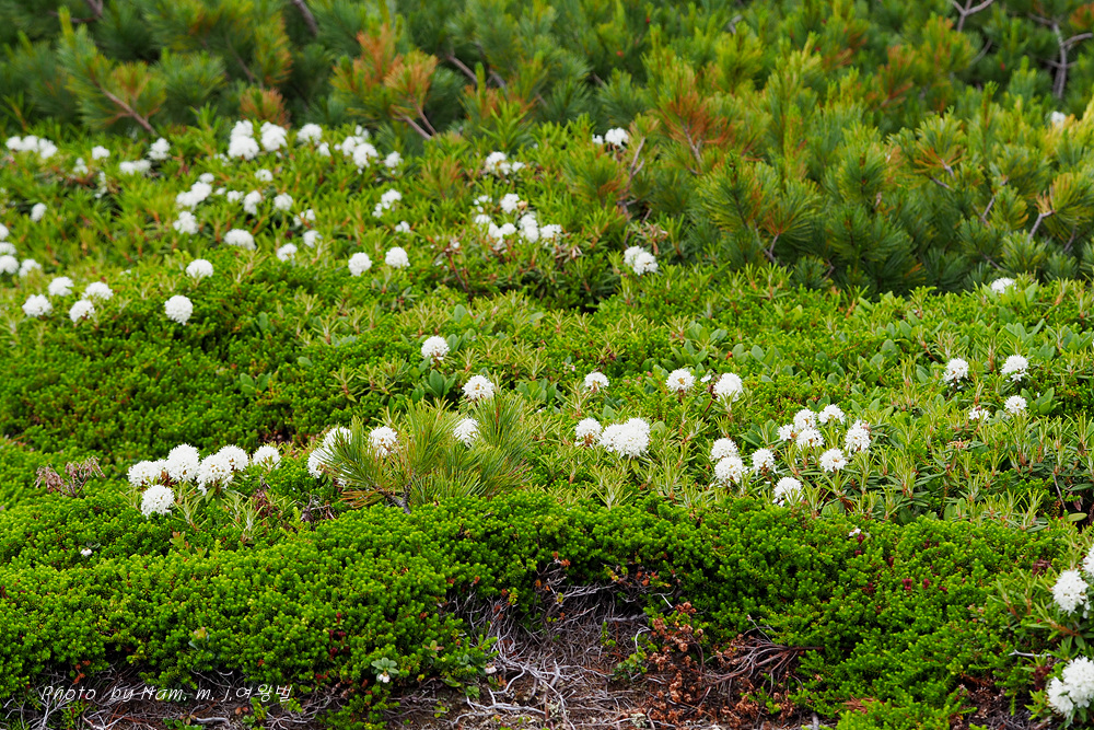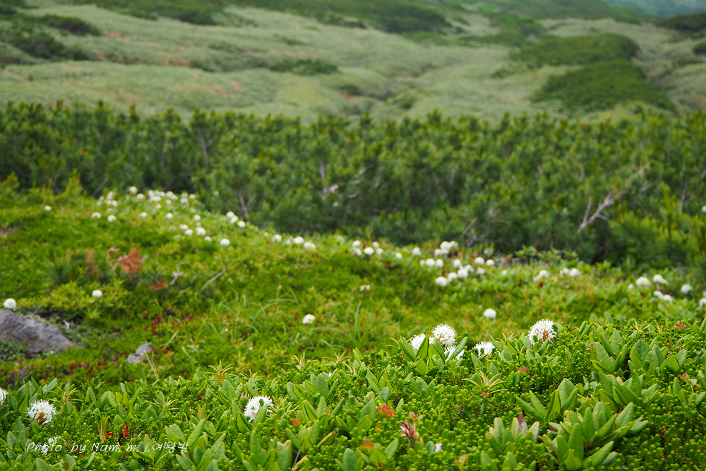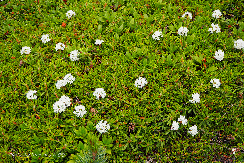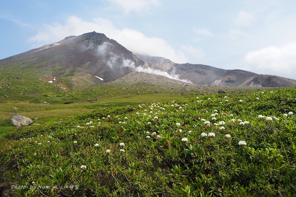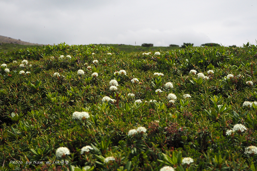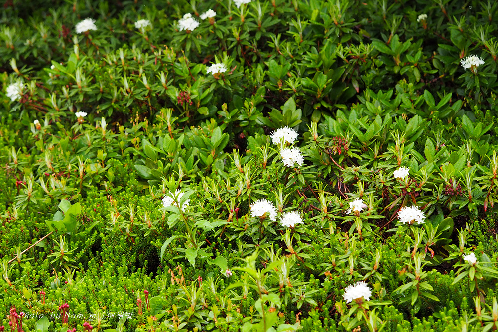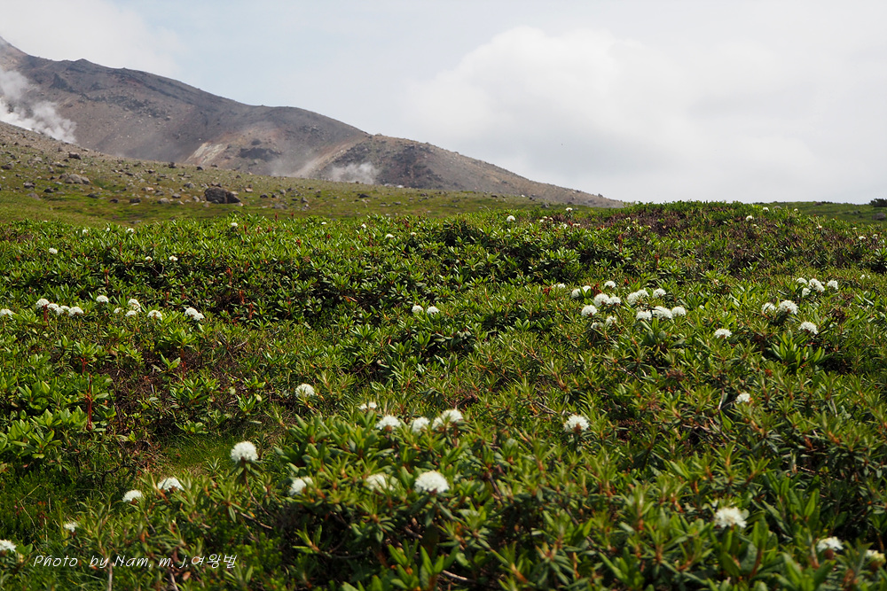나는 느적느적 분화구에서 올라오는 연기를 관망하면서 왜성관목들로 덮여 있는 등산로 주변을 살폈다. 백산차가 눈밭 초지를 덮고 있는 모습도 그림 같다.