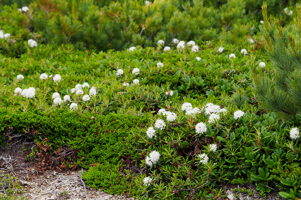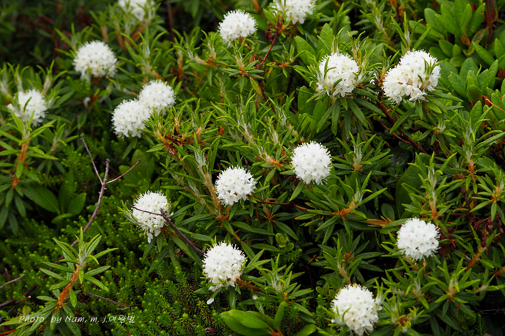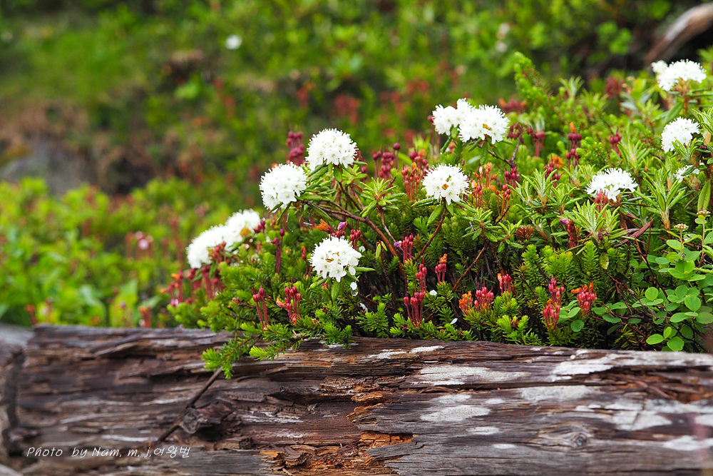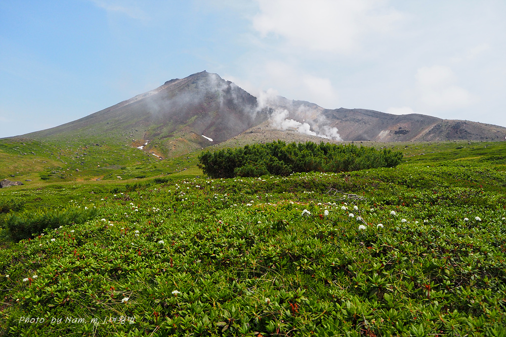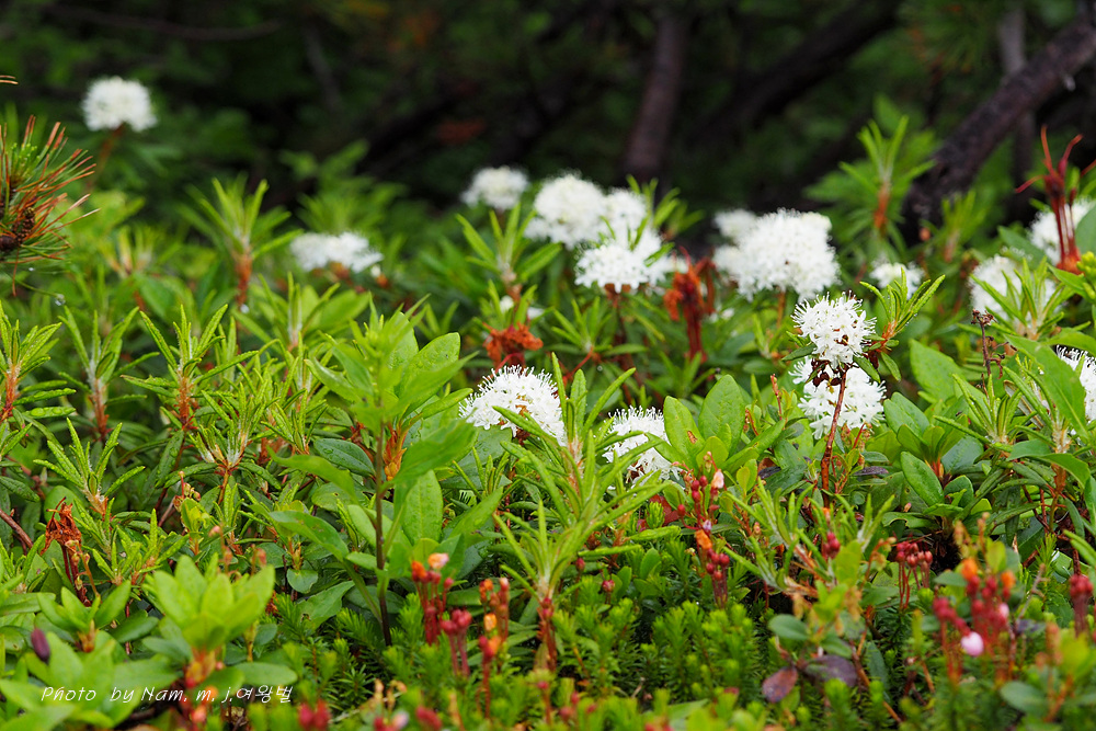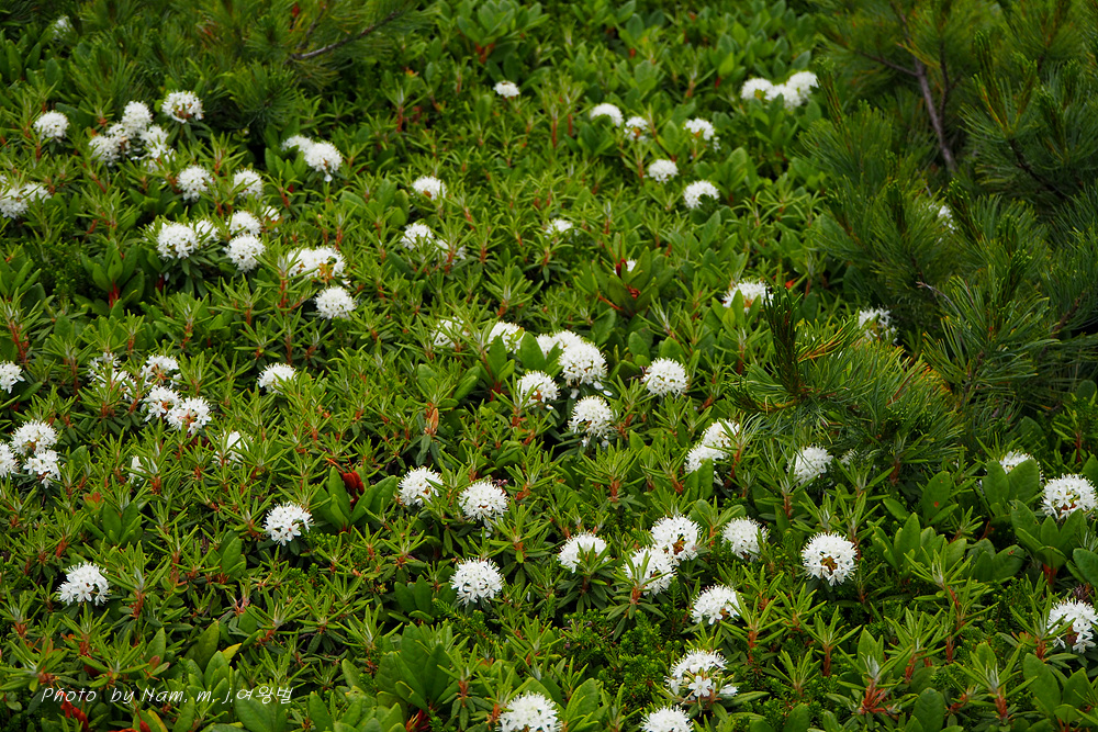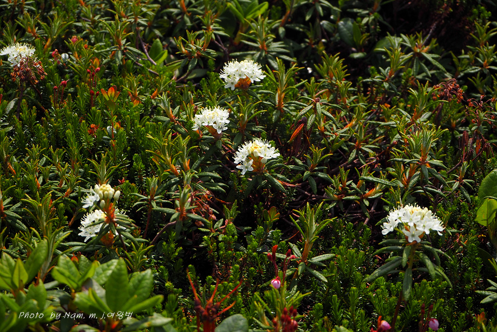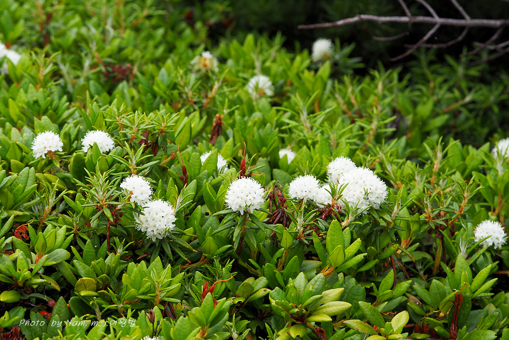 나는 느적느적 분화구에서 올라오는 연기를 관망하면서 왜성관목들로 덮여 있는 등산로 주변을 살폈다. 백산차가 눈밭 초지를 덮고 있는 모습도 그림 같다.