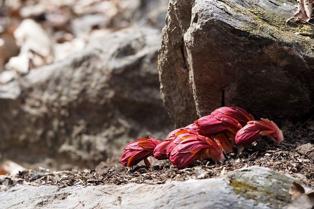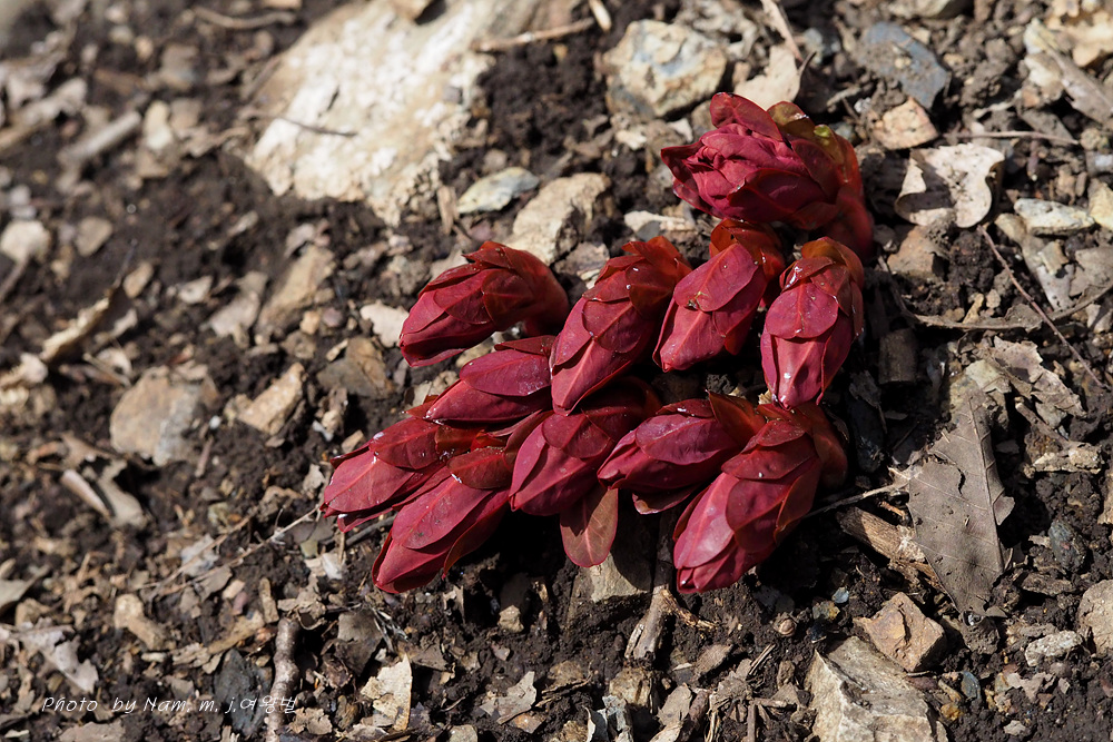아직 주먹을 펴지 못하고 있는 붉은대극이다. 아마 지금 쯤 붉은 잎을 젖히기 시작했을 거다.